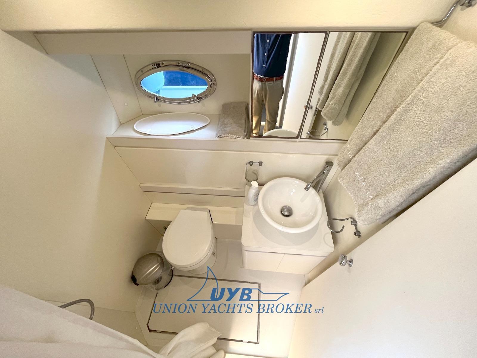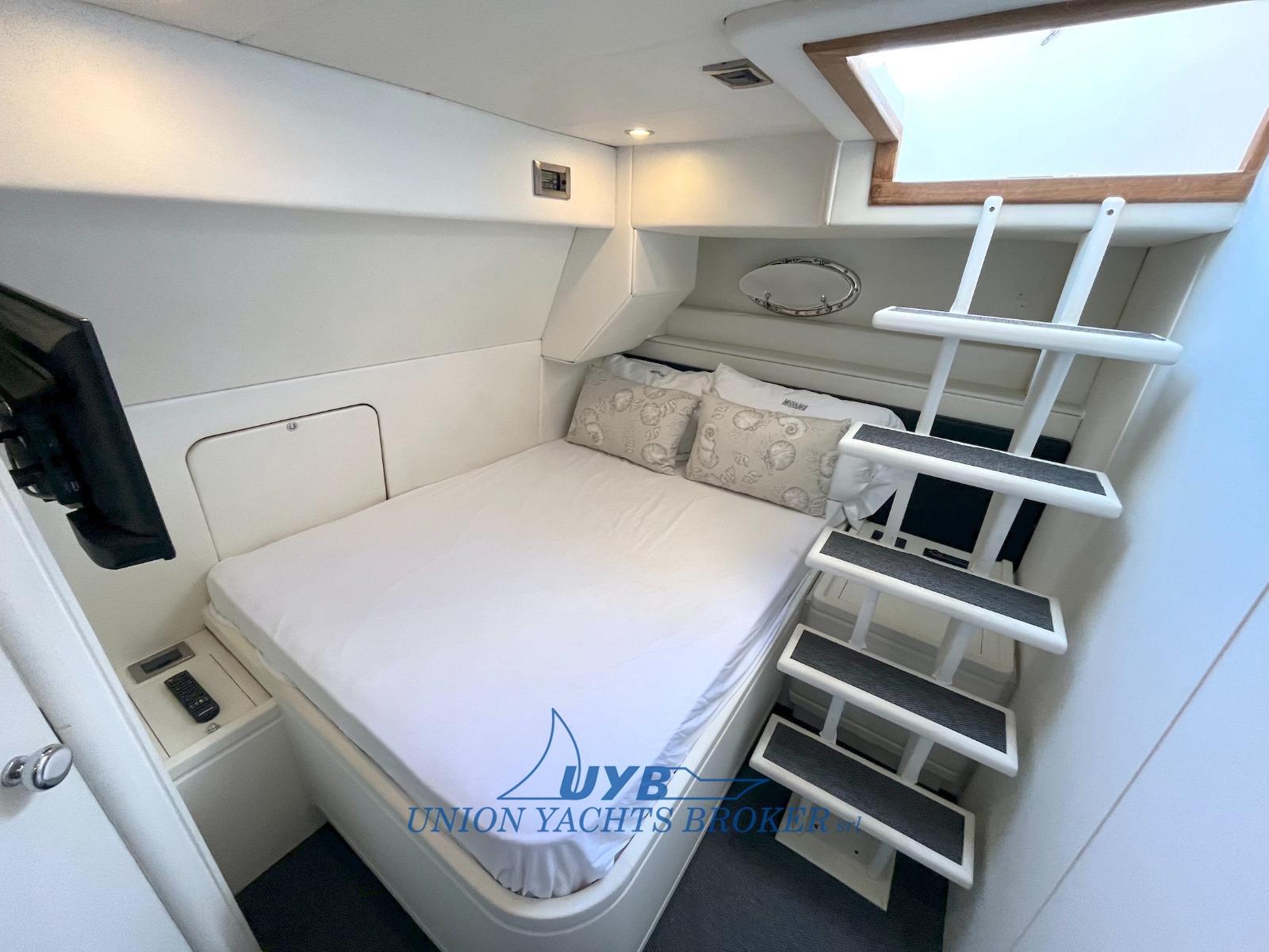 Cabina armatoriale prua con letto matrimoniale, armadi laterali e bagno privato con doccia;