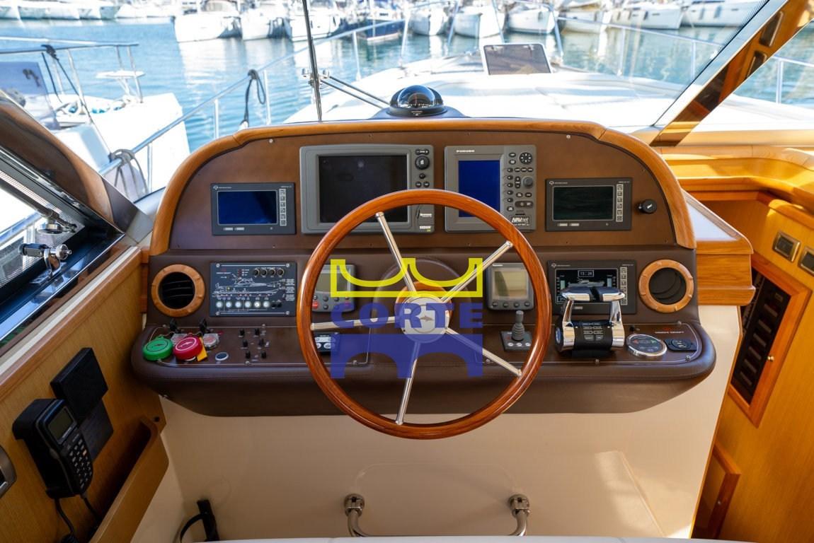Antenna radar, Bussola (Riviera), Comando motori elettronico, Display, GPS (Geonav 11), Pilota automatico (Raymarine ST6002), Radar (Furuno Navnet Vx2), Radio VHF (Simrad Rs 82), Sedile Copilota.