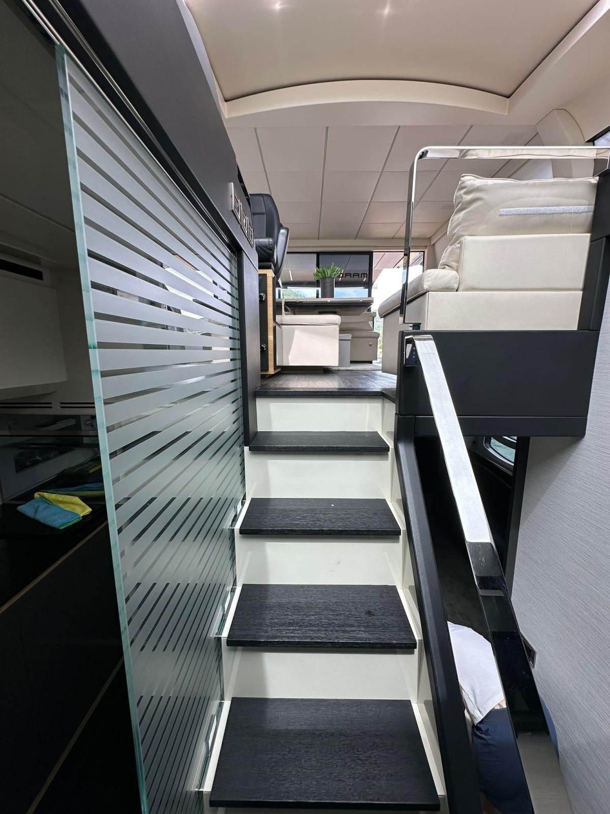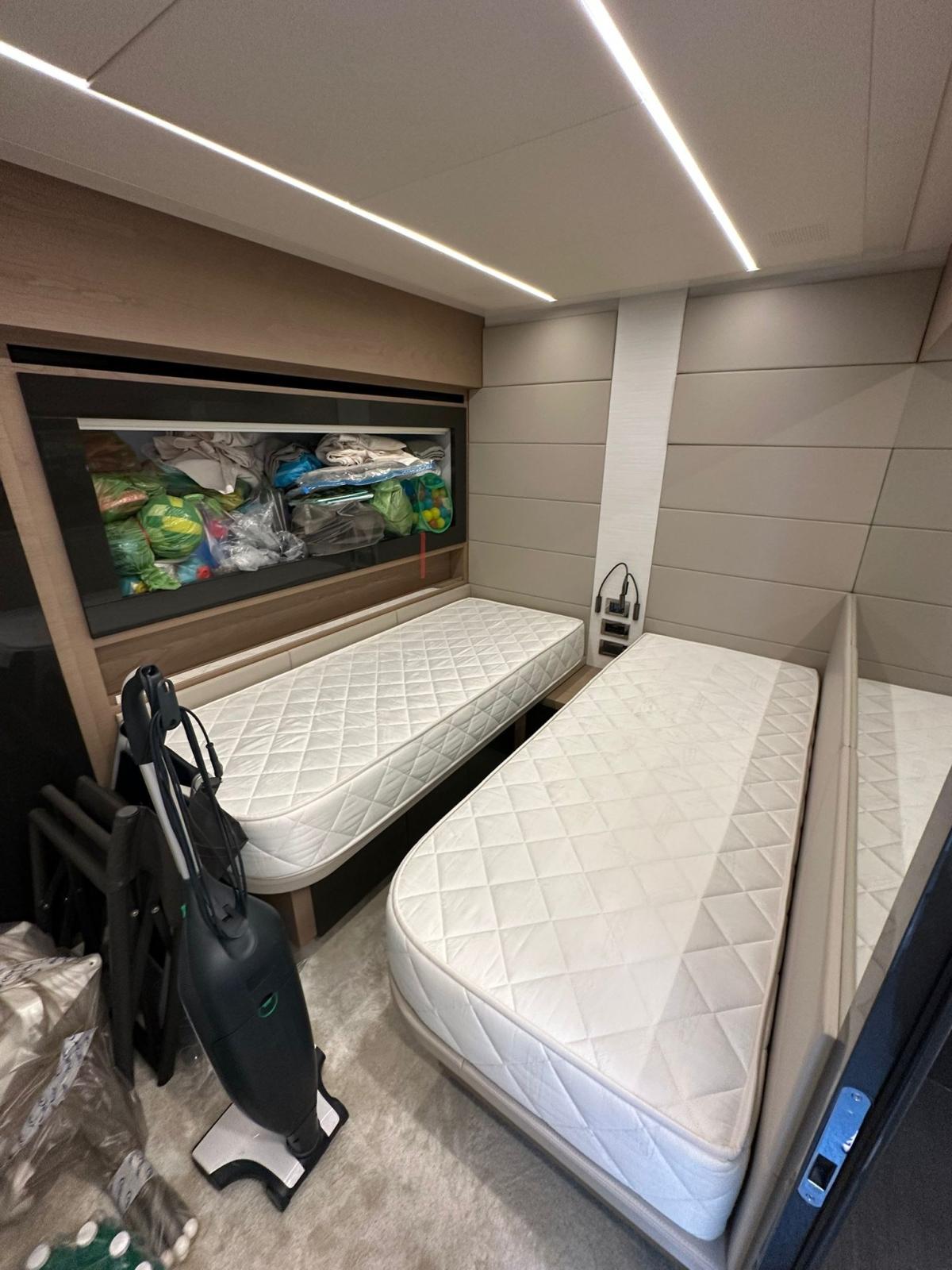 BBQ/ Grill, Boiler, Cassaforte, Clima reversibile, Collegamento internet, Dissalatore (IDROMAR 200 L/H), Impianto acque nere, 2 Inverter, Pavimento interno in legno, Prese interne 12v, Prese interne 220v, Serbatoio Acque Nere, 2 Telecamera, 4 WC marino elettrico.