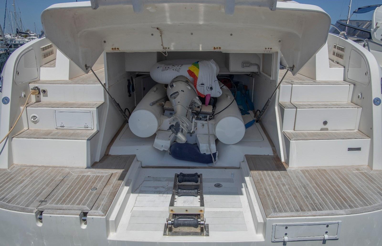 Allarme motore, Allarme sentina, Apertura Vano Motore Elettrica, Auto Dynamic Trim Interceptor, Autoclave, Auto-Trim, Bitte Abbattibili, Camminamenti laterali in teak, Doccia esterna, Flap elettrici, Garage per tender, Hard top, Impianto antincendio, Luci subacquee, Pompa di sentina automatica, Porta ingresso, Pozzetto Teak, Presa 220V banchina, Salpa Ancore Elettrico, Tavolo pozzetto, Tender, Tromba, T-Top, Winch tonneggio di poppa.