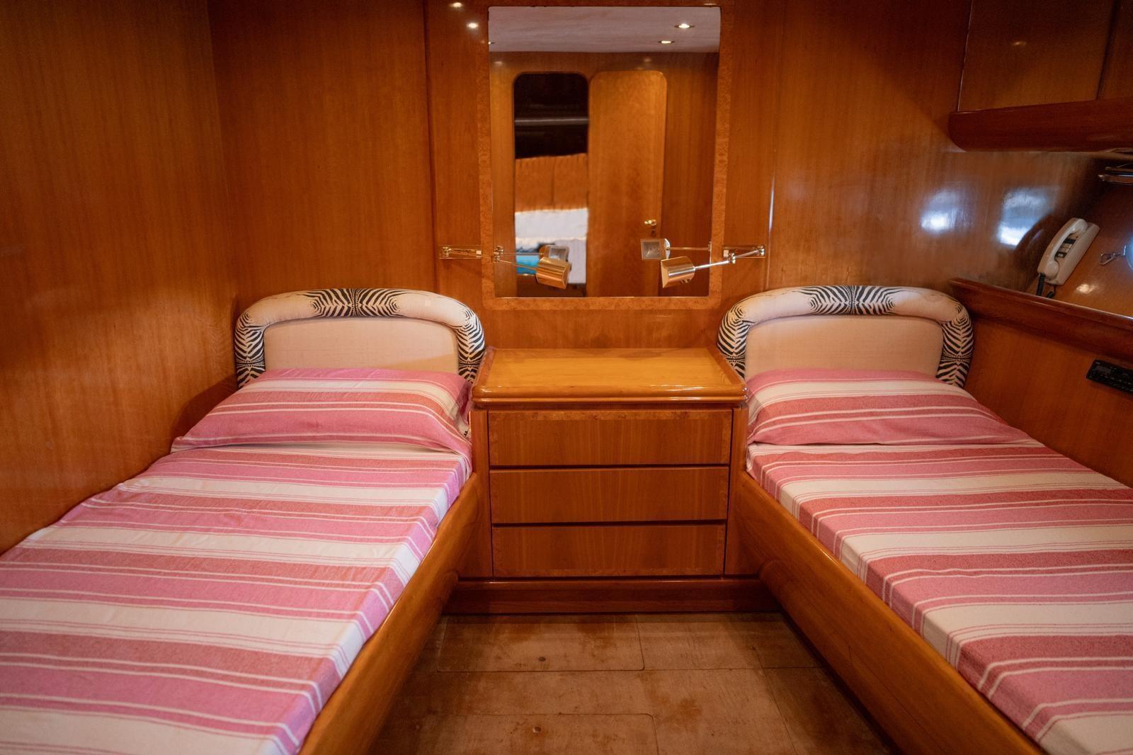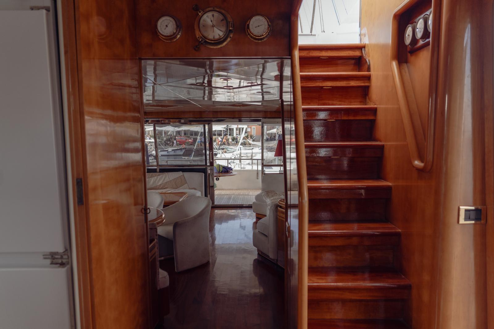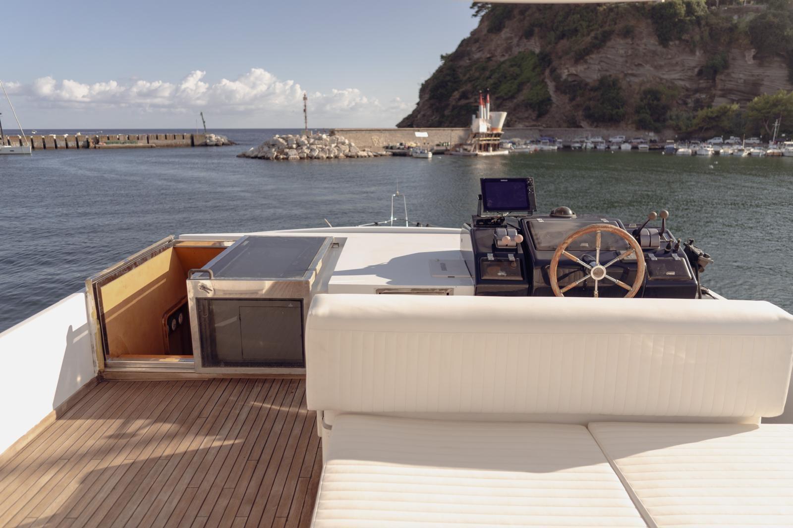 Antenna satelittare, Aria condizionata, Asciugatrice, Autoclave, Autopilota, Barometro, Batterie, Binocolo, Boiler, Bussola, Cuscineria completa, Dissalatore, Doccia esterna, Ecoscandaglio, Frigo e piastra elettrica su fly, GPS, Igrometro, Impianto antincendio fisso in vano motori, Indicatore angolo barra, Tv, Lavastoviglie, Lavatrice, Lettore dvd, Log, Pompe sentina (2 elettriche, 1 manuale), Passerella, Radar, Radio VHF, Salpancora, Stereo, Tavolo con sedute in pozzetto, Tendalino, Tender, Winch tonneggio di poppa