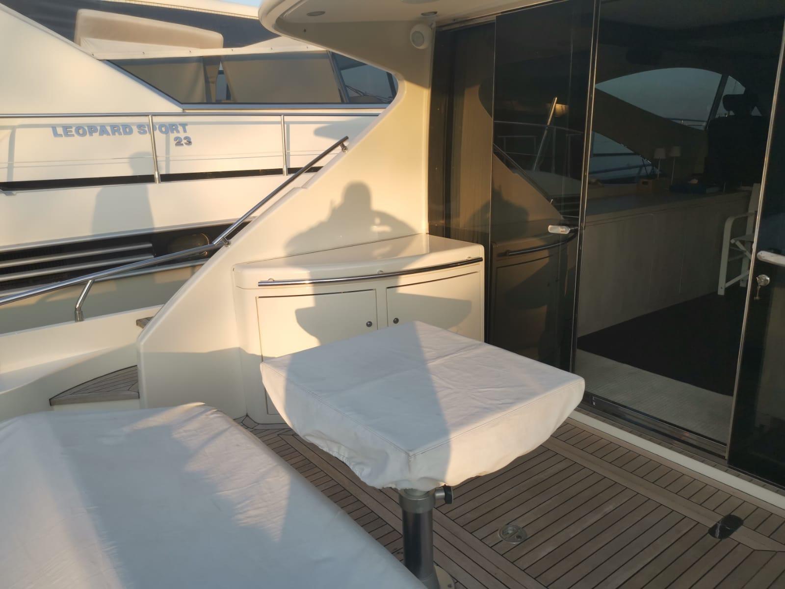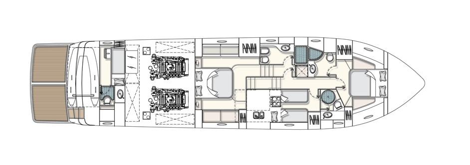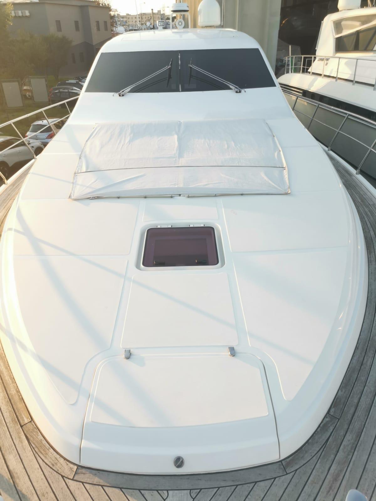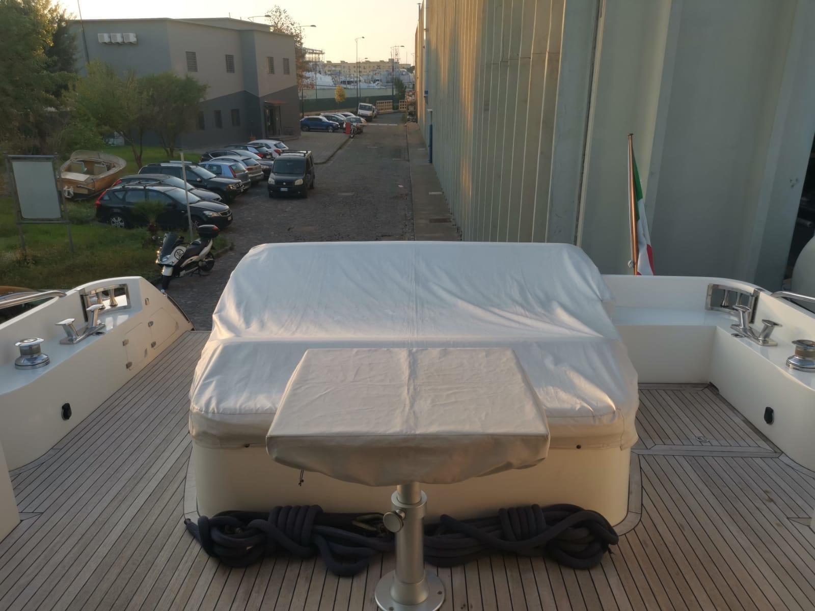 Allarme motore, Allarme sentina, Alternatore, Autoclave, Camminamenti laterali in teak, Doccia esterna, Flap idraulici, Hard top, Impianto antincendio, Indicatori Flaps, Lavandino nel Pozzetto, Luci subacquee, Passerella, Piattaforma, Pompa di sentina automatica, Pompa di sentina manuale, Ponte in teak, Porta ingresso, Pozzetto Teak, Presa 220V banchina, Presa acqua banchina, Salpa Ancore Elettrico, Scaletta da bagno, Selle per Tender, Tavolo pozzetto, Winch tonneggio di prua.