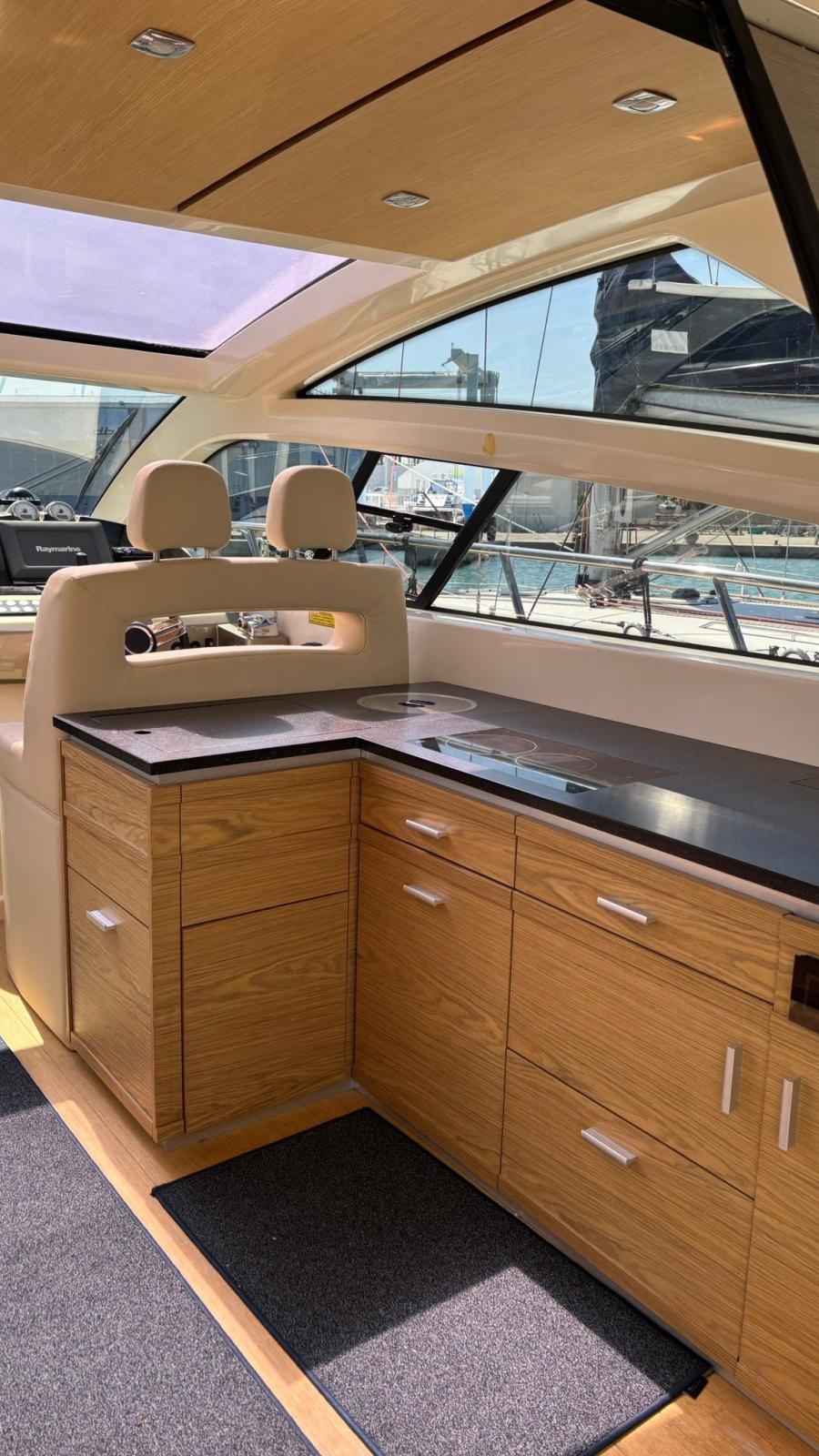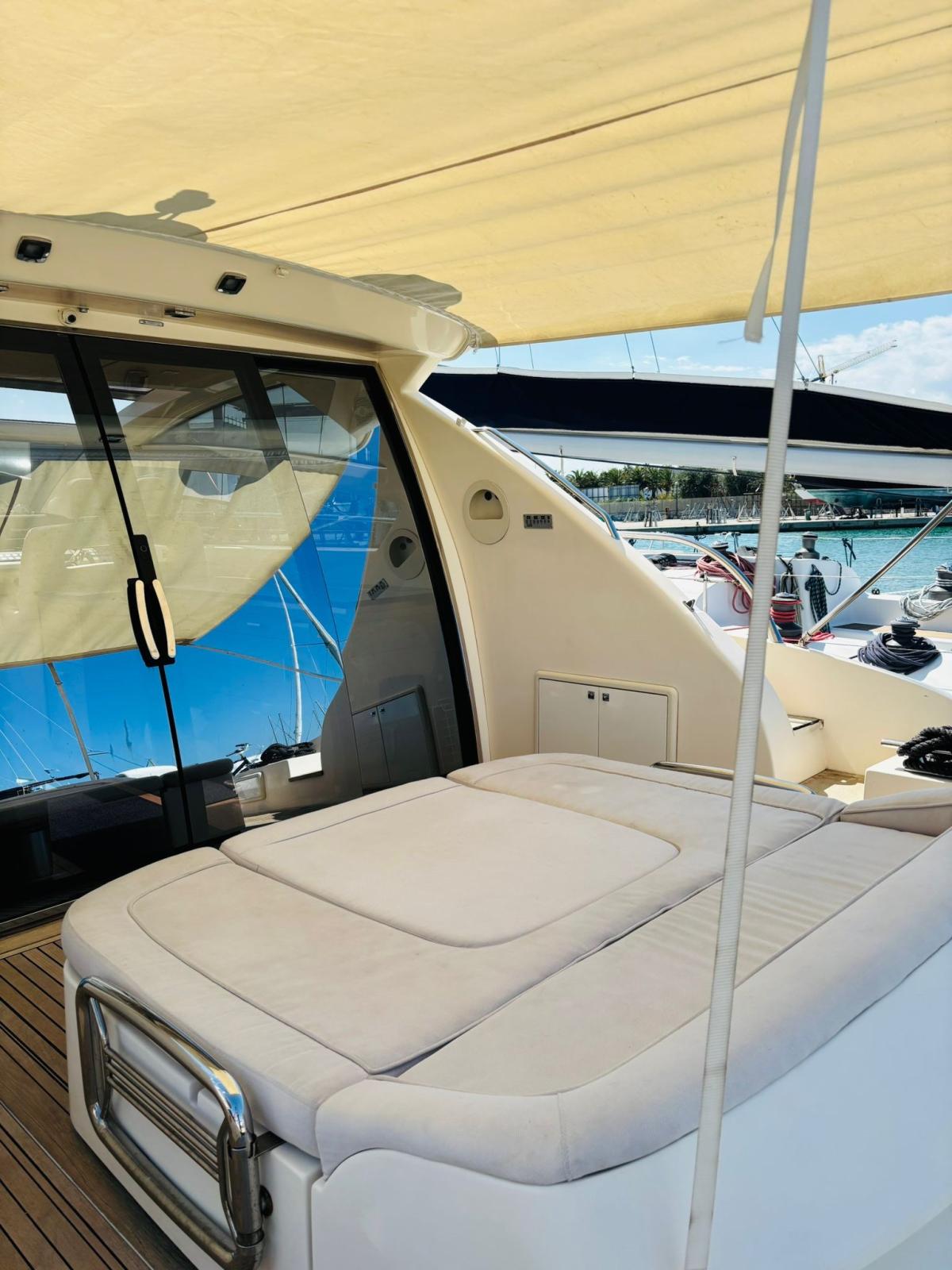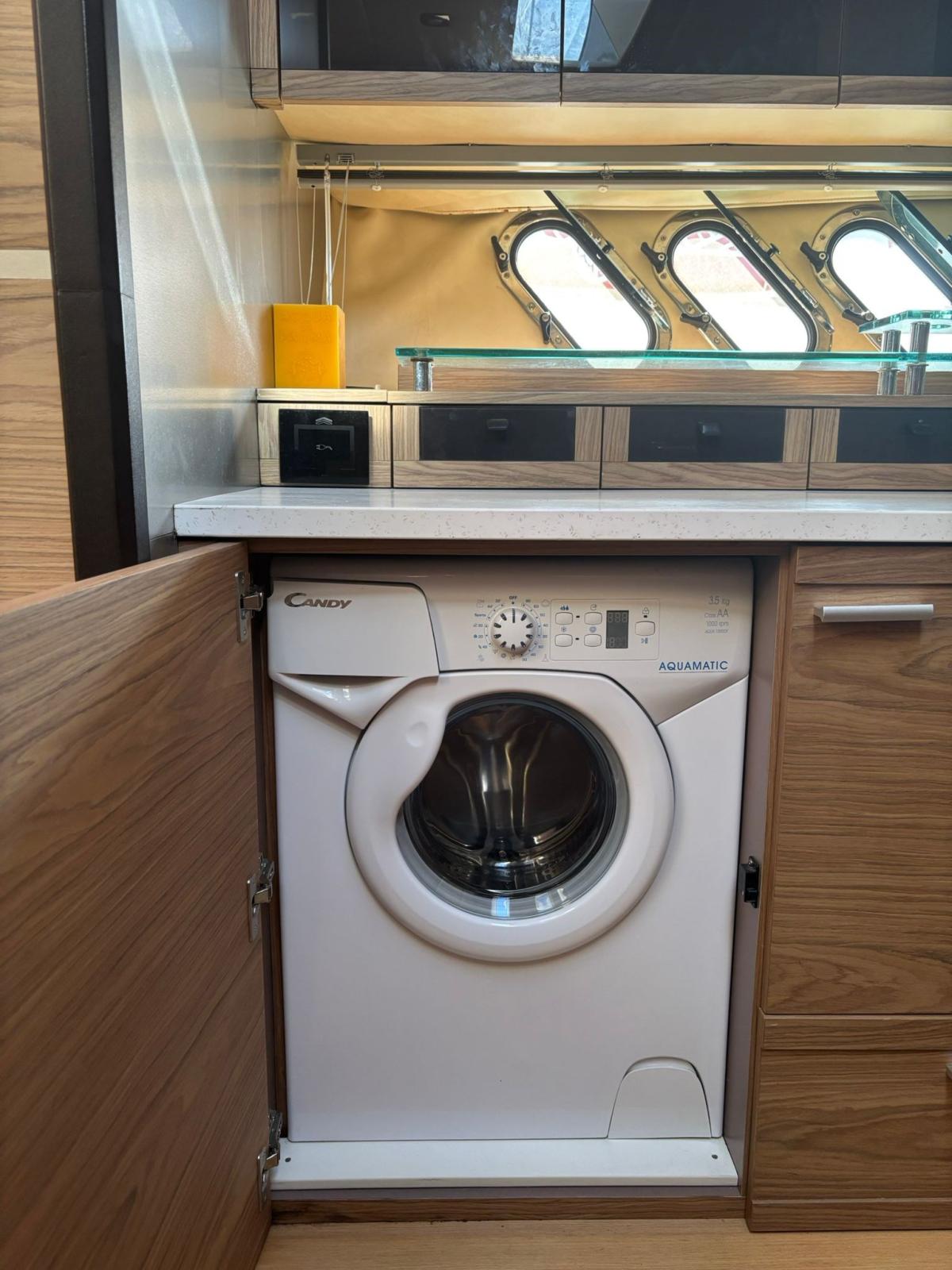 Allarme motore, Allarme sentina, Alternatore, Autoclave, Camminamenti laterali in teak, Cavo corrente di banchina, Doccia esterna, Faro orientabile, Flap idraulici (BENNET - CON INDICATORE DI POSIZIONE), Garage per tender (Con apertura elettrica), Hard top, Luci subacquee, 2 Pannelli Solari (Montati sull’hard top), Passerella, Pompa di sentina automatica, Porta ingresso, Pozzetto Teak, Presa 220V banchina, Salpa Ancore Elettrico, Tavolo pozzetto, Tender (Con fuoribordo Johnson 2,5).