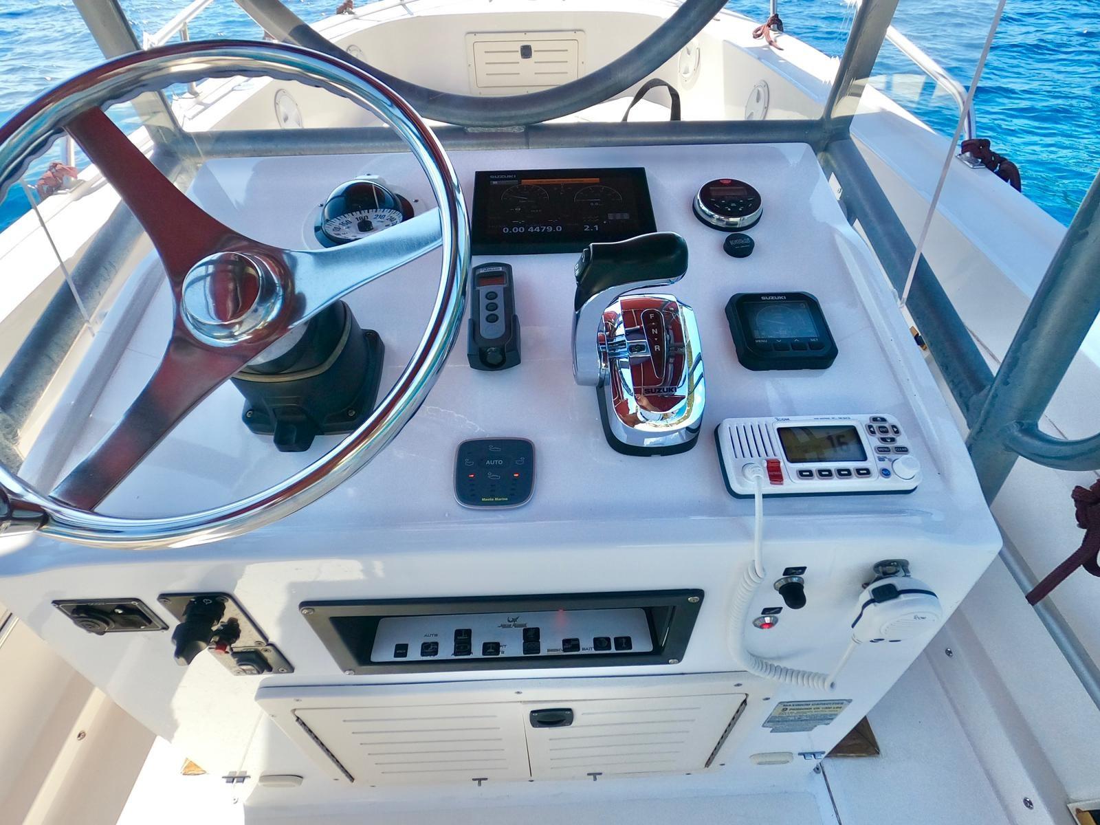 Angolo barra, Comando motori elettronico, Contametri catena, DSC vhf, Mappe e guide, Monitor dei consumi, Plotter con antenna GPS, Quadro comandi.
