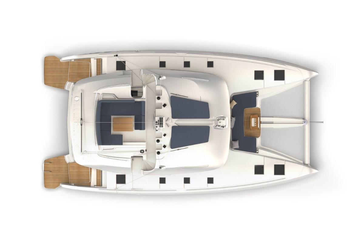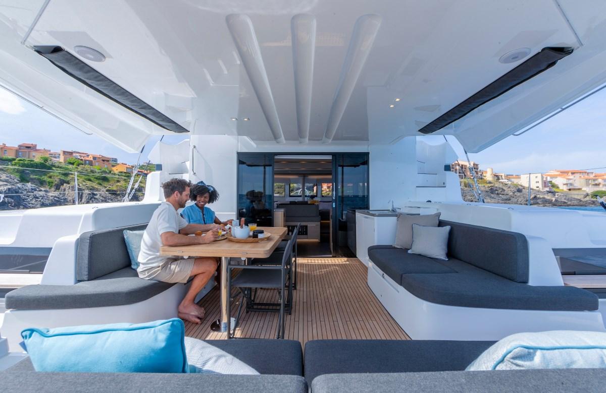 Prima novità fra tutte sono gli spazi esterni ottimizzati: il flybridge del Lagoon 51 è innovativo per la modularità dei suoi spazi, la geniale ergonomia e il comfort di questo ampio spazio conviviale. Il flybridge è stato riformulato per occupare l'80% della tuga con 2 bei prendisole a prua della timoneria e un'ampia zona con sedute a C, in cui il tavolo centrale può essere abbassato per creare un prendisole XL.