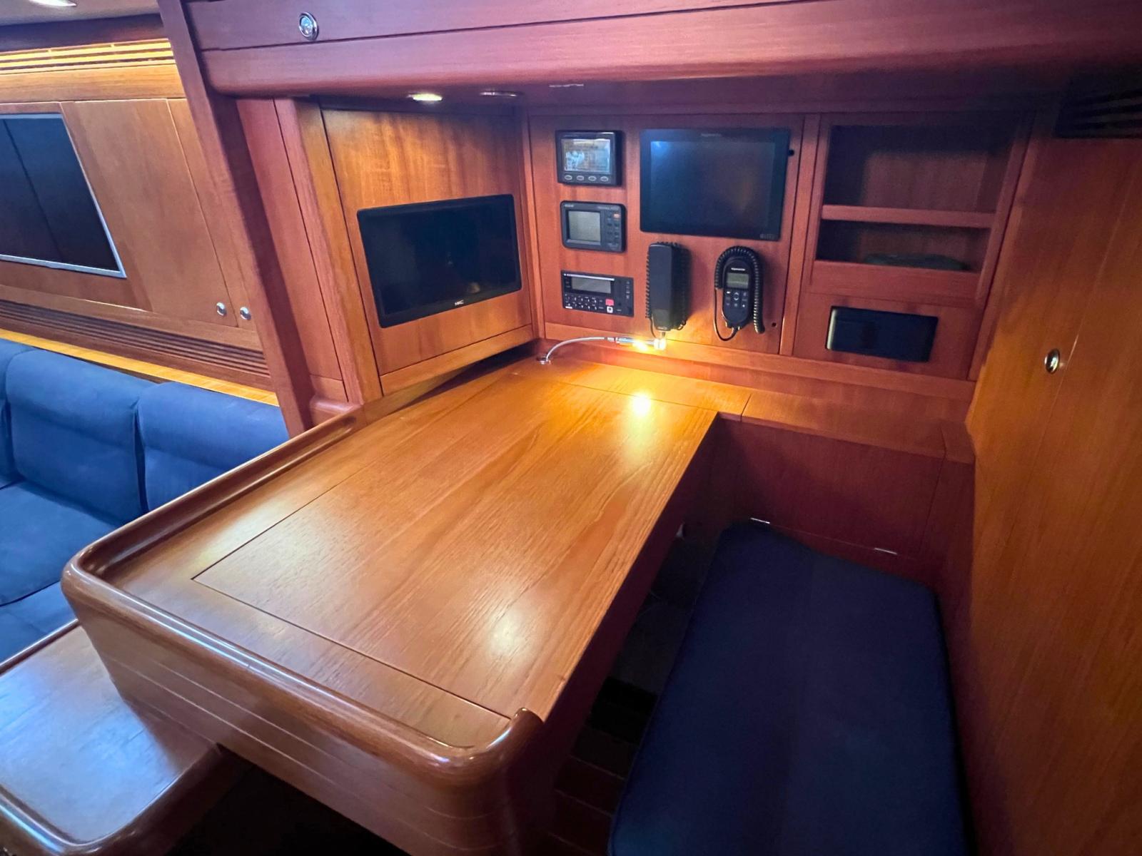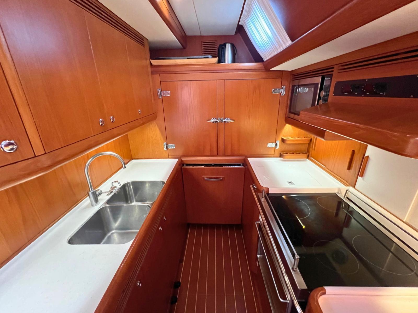 Gli interni, in teak satinato color miele, offrono un layout con tre cabine doppie e tre bagni en-suite, inclusa una cabina armatoriale con letto centrale e doccia separata. La cucina è completamente attrezzata per la crociera di lungo periodo, con elettrodomestici di dimensioni domestiche e ampi volumi di stivaggio.