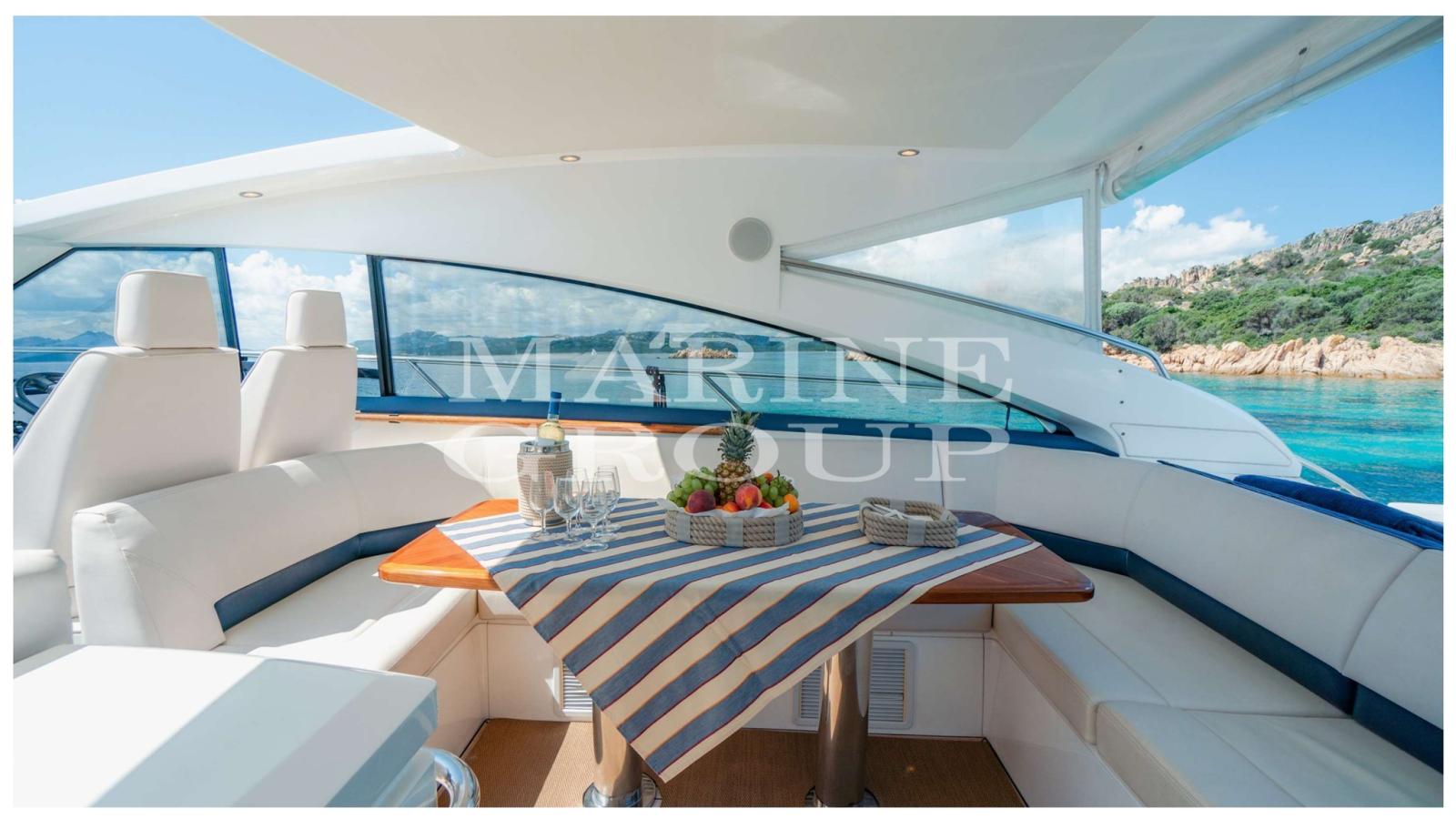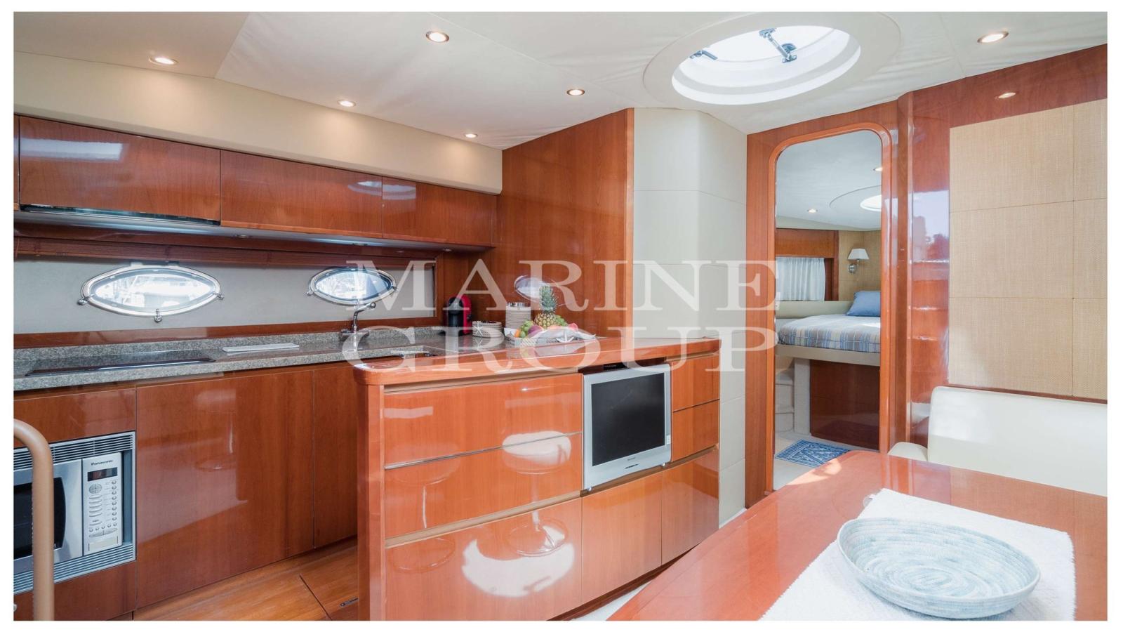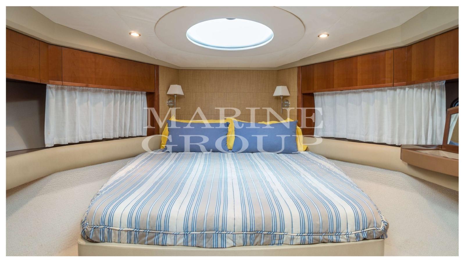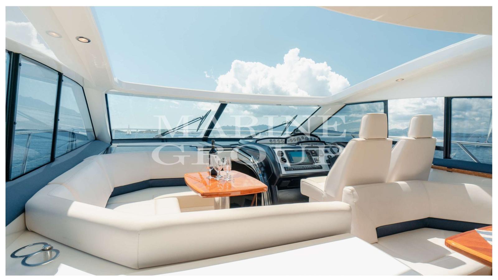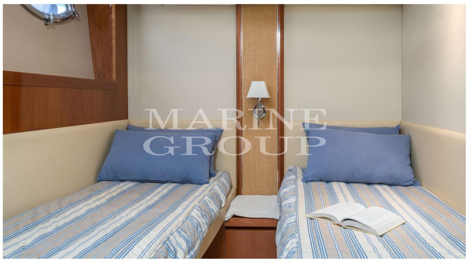 Interni in essenza di ciliegio chiaro lucido; parquet di Rovere; Ampia dinette con divano a "C" e tavolo centrale; Cucina a "L" completamente attrezzata; Cabina armatoriale a prua con bagno ensuite; Cabina di poppa con due letti singoli in piano; Seconda cabina di poppa con letti singoli a castello; Secondo servizio con box doccia.