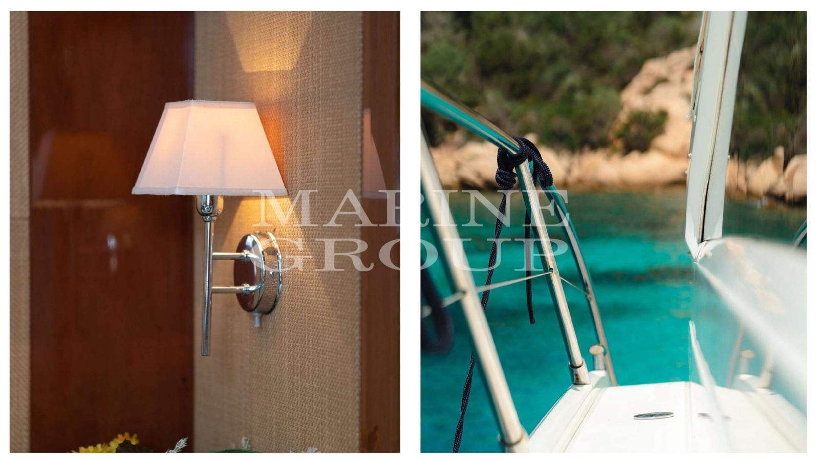 Colorazione speciale (blu), Doccia esterna, Flap idraulici, Garage per tender, Hard top, Lavandino nel Pozzetto, Luci di cortesia, Passerella, Piattaforma, Porta ingresso, Pozzetto Teak, Presa 220V banchina, Presa acqua banchina, Salpa Ancore Elettrico, Scaletta da bagno, Tavolo pozzetto, Tromba.