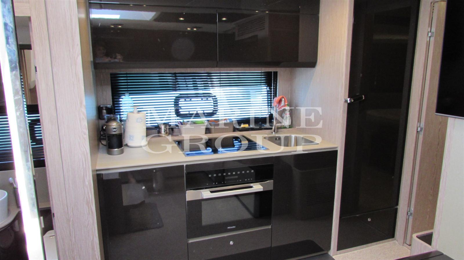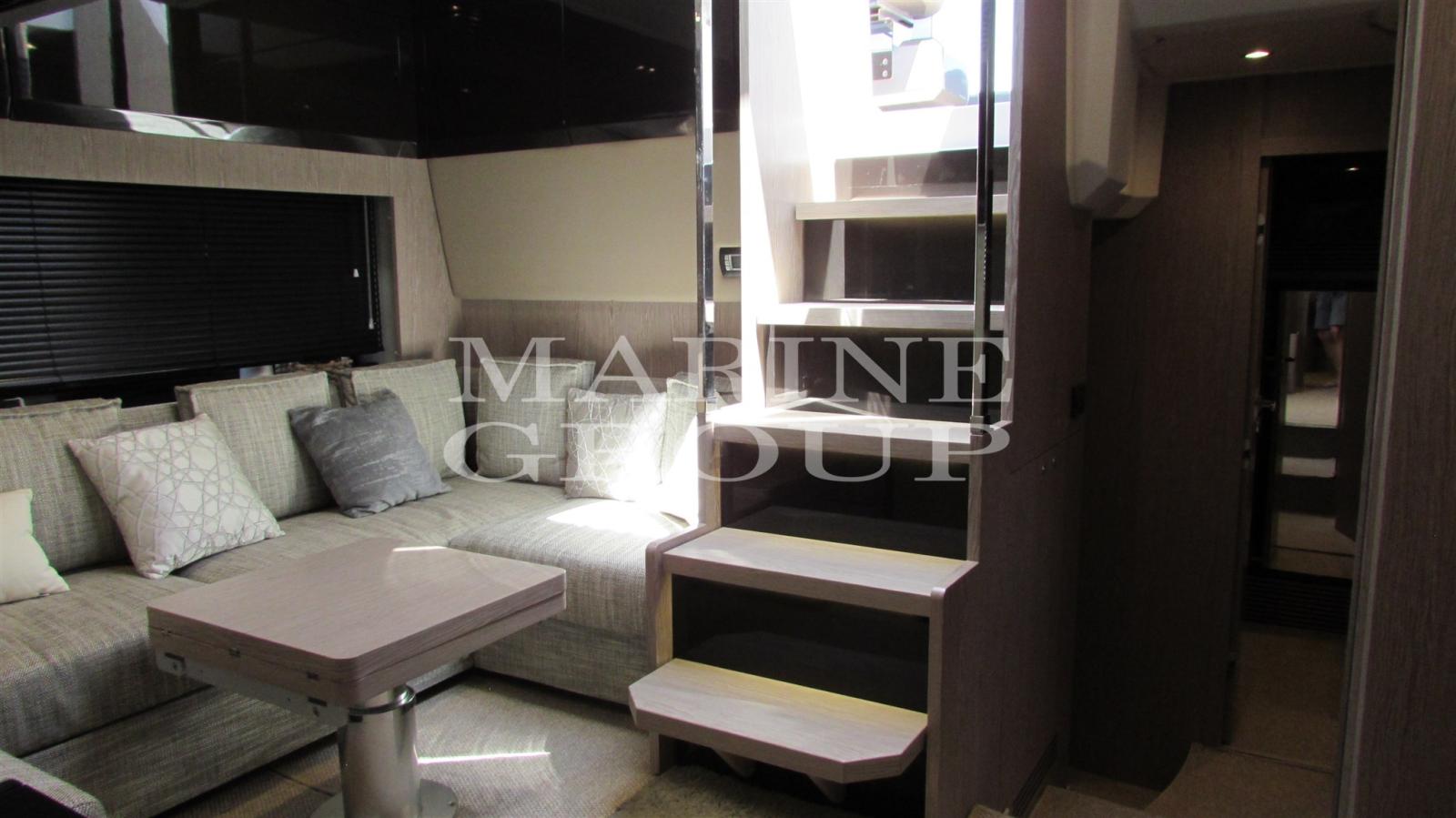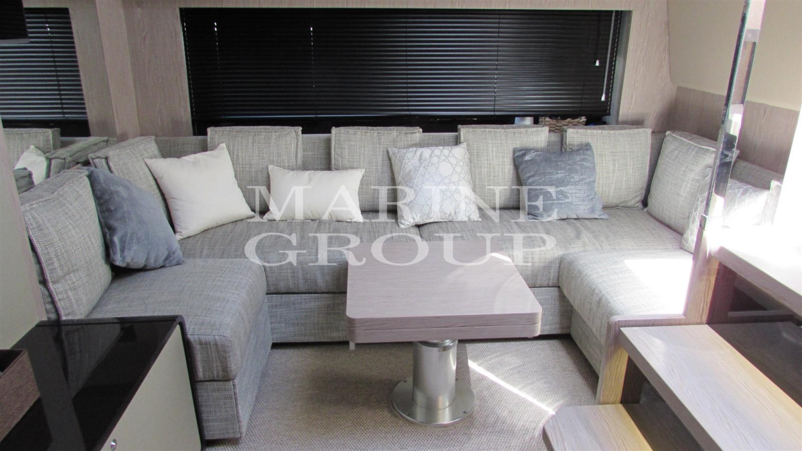 Ambiente arioso e spazioso che vede perfettamente frontestanti l'ampia dinette e la cucina completamente attrezzata; Cabina armatoriale matrimoniale a prua incorniciata da grandi vetrate ed innondata di luce naturale con bagno en suite completo di box doccia separato; cabina VIP a centro barca con letti separati che possono all'occorrenza trasformarsi in un letto queen-size; generosa terza cabina con letti a castello; secondo bagno con box doccia separato.