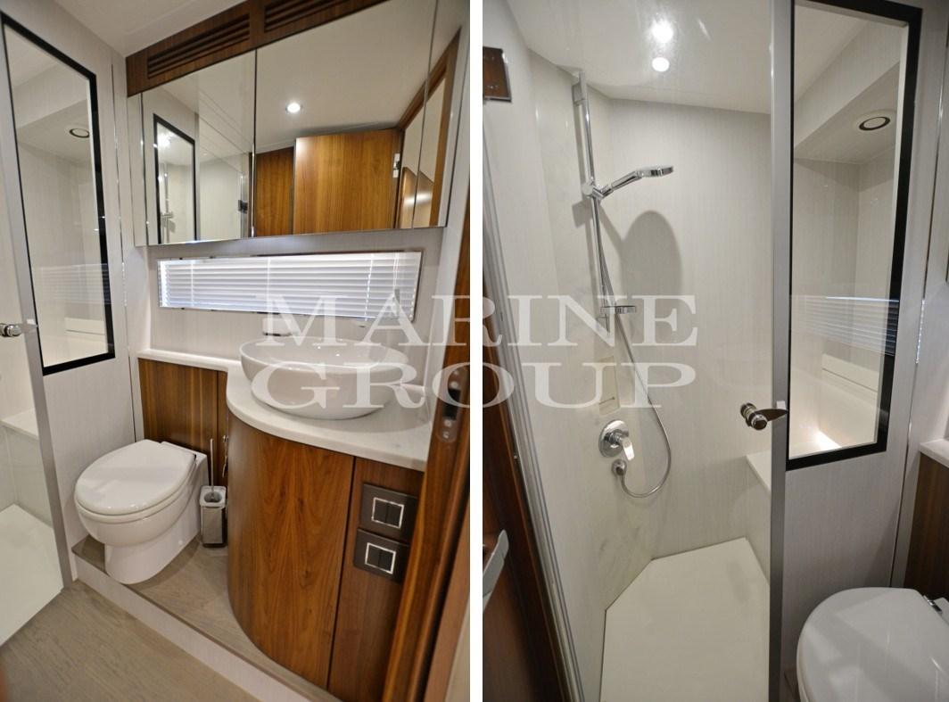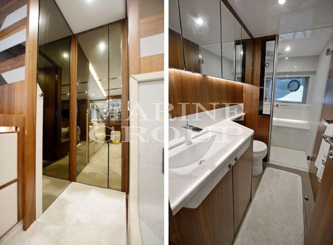 Interni in essenza di Noce satinato - Parquet in Rovere - Rivestimenti interni pelle pieno fiore Bentley - Grande salone con tavolo elettrico - Cucina equipaggiata - Cabina armatoriale a centro barca con bagno ensuite - Cabina VIP a prua con bagno ensuite - Cabina ospiti con due letti singoli con bagno ensuite - Disimpegno con quarto bagno per uso giornaliero - Cabina equipaggio a poppa per una persona completa di bagno.