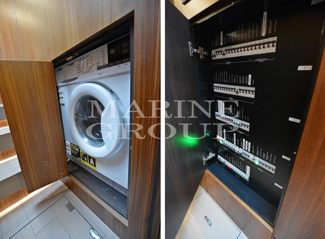 Aria condizionata, BBQ/ Grill, Boiler, Clima reversibile, Congelatore (nella lobby), Cuscineria completa, Cuscineria di poppa, Cuscineria di prua, Cuscineria Pozzetto, Dissalatore (130l/h Osmosea), ICE Maker, Impianto acque nere, Inverter, Lavasciuga, Lavastoviglie, Oscuranti (Film anti UV), Pavimento interno in legno (di rovere), Piastra in vetroceramica, Prese interne 12v, Prese interne 220v, Telecamera (sala macchine e pozzetto), Tenda Elettrica (nel pozzetto), Zanzariere (in tutti gli oblò), Ancora (INOX 75mt), Antenna radar, Caricabatterie, Comando motori elettronico, Doccia esterna, Elica di poppa - stern thruster (proporzionale), Elica di prua - bow thruster (proporzionale), Faro orientabile, Flap idraulici, Garage per tender, Hard top, Lavandino nel Pozzetto, Log, Luci di cortesia, Luci subacquee (bicolore bianco/blu), Passerella (telescopica 4.5m), Piattaforma (affondante elettroidraulica), Porta ingresso, Porta laterale, Pozzetto Teak, Presa 220V banchina, Presa acqua banchina, Salpa Ancore Elettrico, Scaletta da bagno, Tavolo pozzetto, Tavolo Salone Abbattibile (elettricamente), 2 Winch tonneggio di poppa.