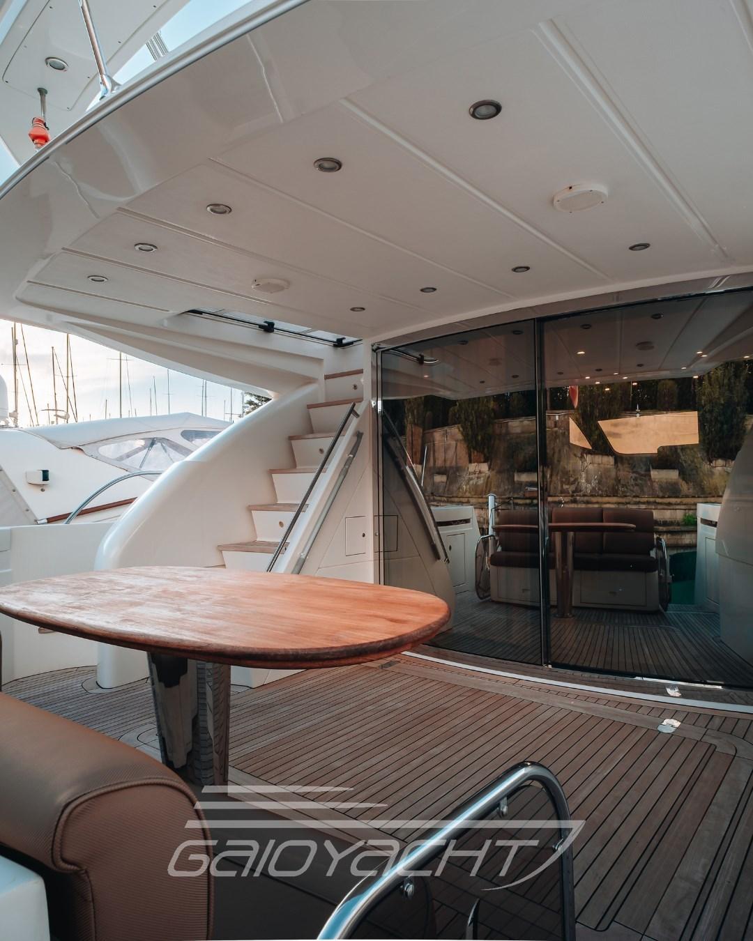 Allarme fumo/gas, Allarme motore, Allarme sentina, Ancora (Da sostituire), Apertura Vano Motore Elettrica, Auto Dynamic Trim Interceptor, Autoclave, Auto-Trim, Camminamenti laterali in teak, Doccia esterna, Doppia timoneria, Faro orientabile, Flap elettrici, Gruette, Gruette per tender, Impianto antincendio, Indicatori Flaps, Luci di cortesia, Passerella, Piattaforma, Pompa di Scarico del Serbatoio Acque Reflue, Porta ingresso, Porta laterale, Pozzetto Teak, Presa 220V banchina, Presa acqua banchina, Ripetitore strumentazione, Salpa Ancore Idraulico, Scaletta da bagno, Selle per Tender (Predisposizione), Tavolo pozzetto, Tromba, Tuga in teak, Winch tonneggio di poppa.