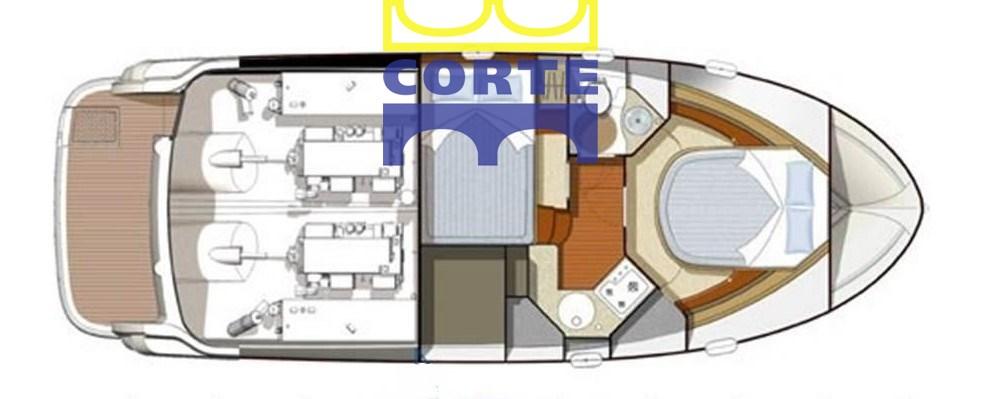 Dinette, Cucina, Cabina con letto matrimoniale a prua, cabina con letto alla francese a poppa, bagno.
