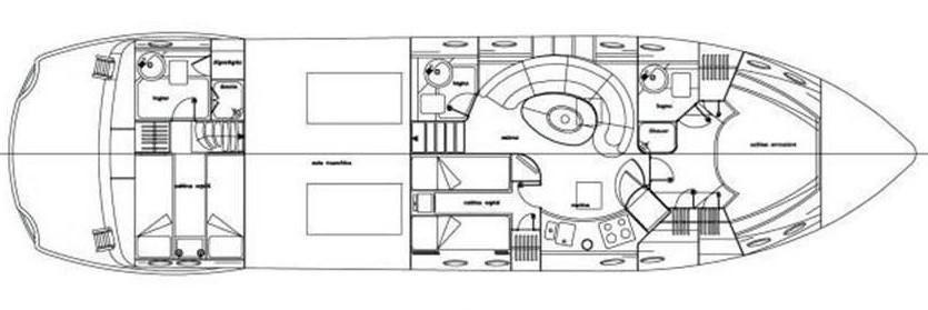 Cabina armatoriale con letto matrimoniale e bagno - cabina Vip con letto alla francese e bagno - cabina ospiti con due letti in piano - bagno ospiti.