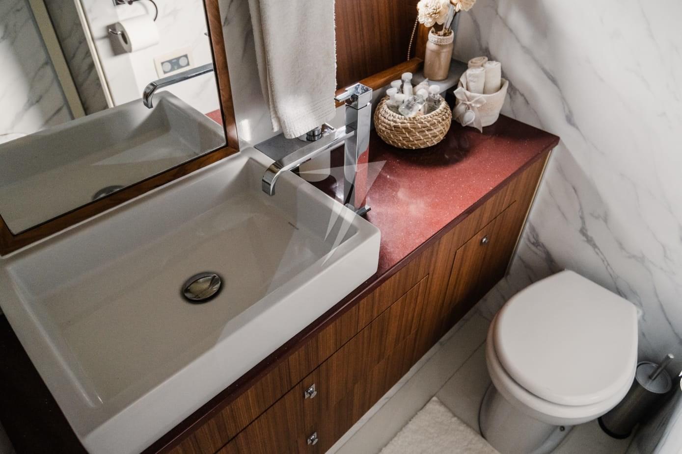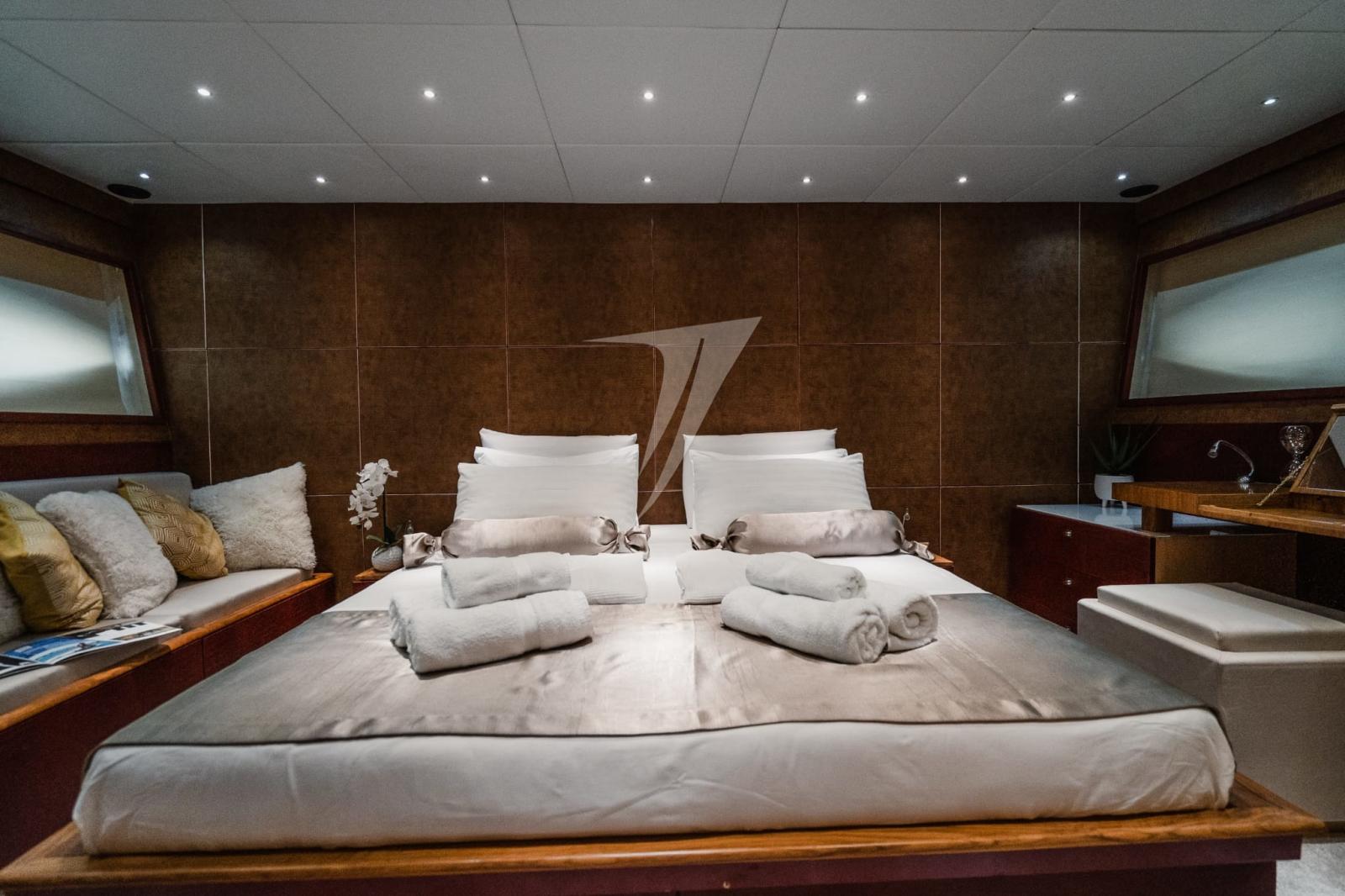 Questo modello offre spazi ben distribuiti e grande vivibilità sia all’interno che all’esterno. La carena in vetroresina con trasmissione in linea d’asse è motorizzata con due MTU 10V2000 M93 per una potenza complessiva di 3004 HP, permettendo di raggiungere una velocità massima indicativa di circa 40 nodi. L’unità è certificata RINA e IVA assolta.