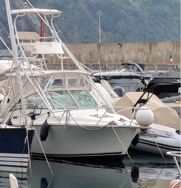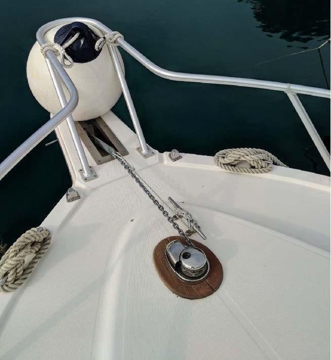 tuna tower con seconda guida, vasca per esca viva e pescato, cuscineria completa, tendalini trasparenti a chiusura, salpa ancora elettrico,