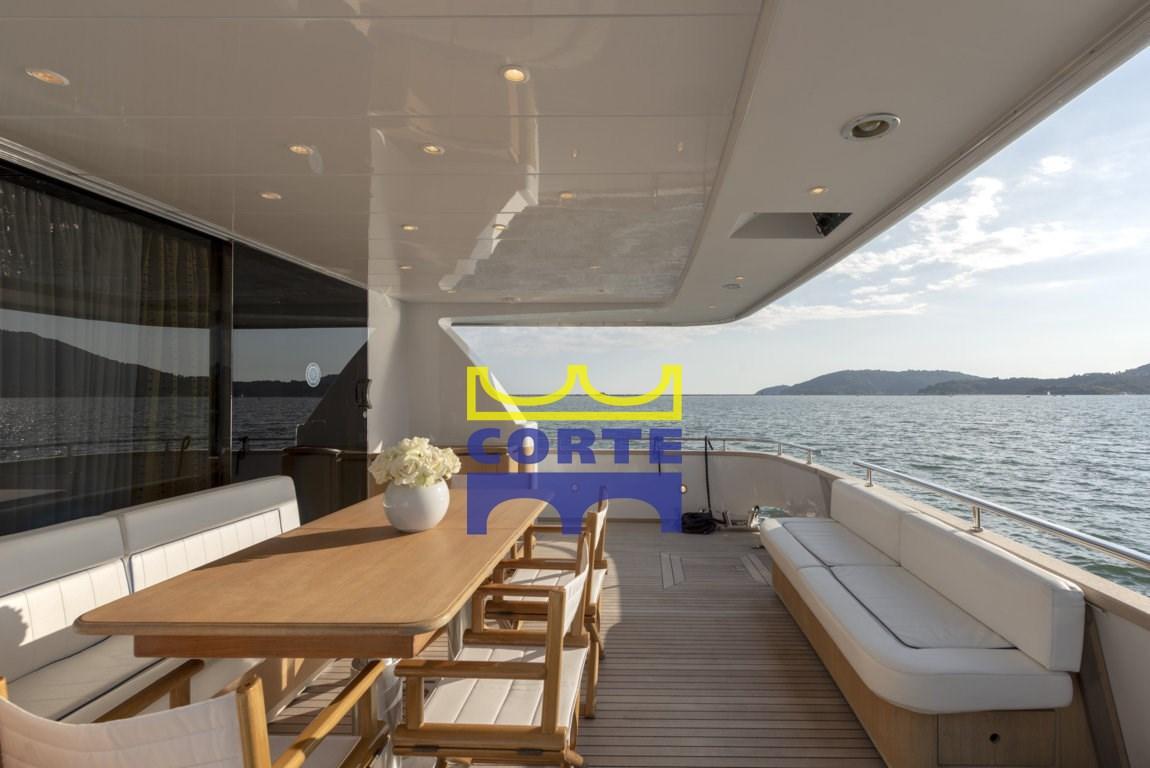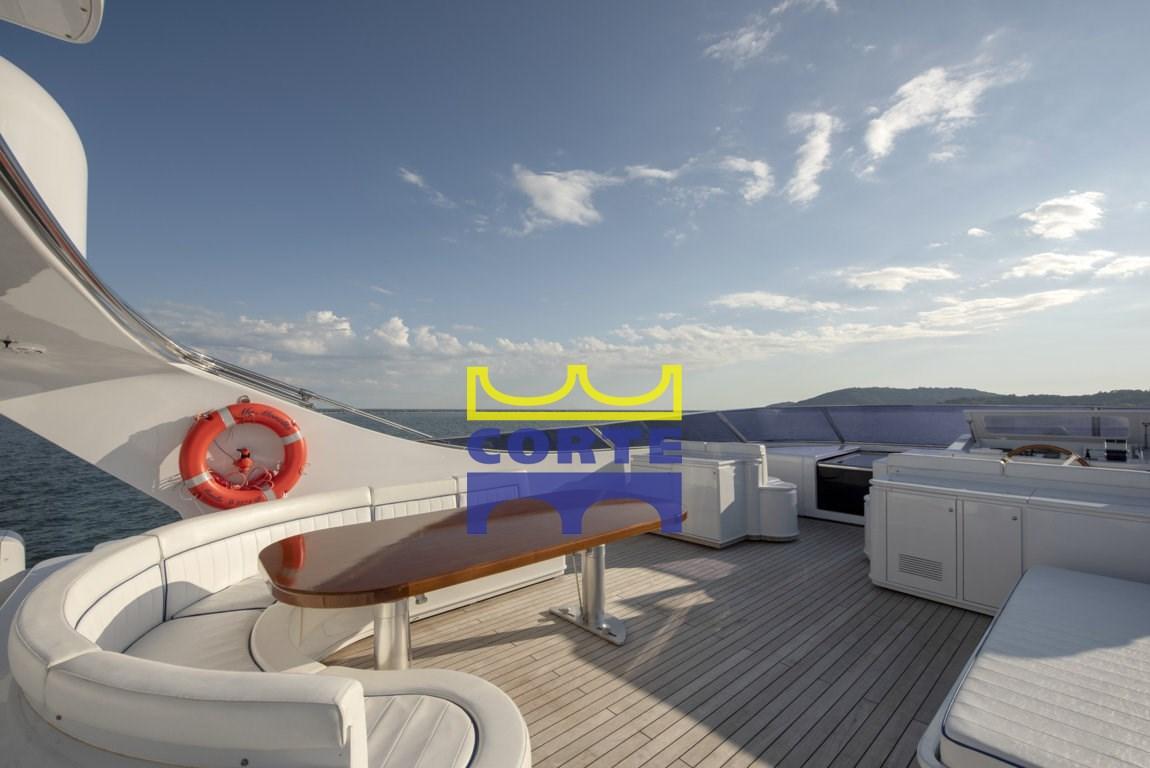 Allarme motore, Allarme sentina, Ancora (con catena 150 metri), Autoclave, Bocche di Lupa, Camminamenti laterali in teak, Doccia esterna, Doppia timoneria, Faro orientabile, Flap idraulici, Gruette per tender su fly, Impianto antincendio, Luci di cortesia, Luci subacquee, Moto d'acqua, Passerella, Pompa di sentina automatica, Porta ingresso, 2 Porta laterale, Pozzetto Teak, Presa 220V banchina, Presa acqua banchina, Rollbar, Salpa Ancore Elettrico, Scaletta da bagno, Tavolo pozzetto, Tender, Tromba, Winch tonneggio di poppa, Winch tonneggio di prua.