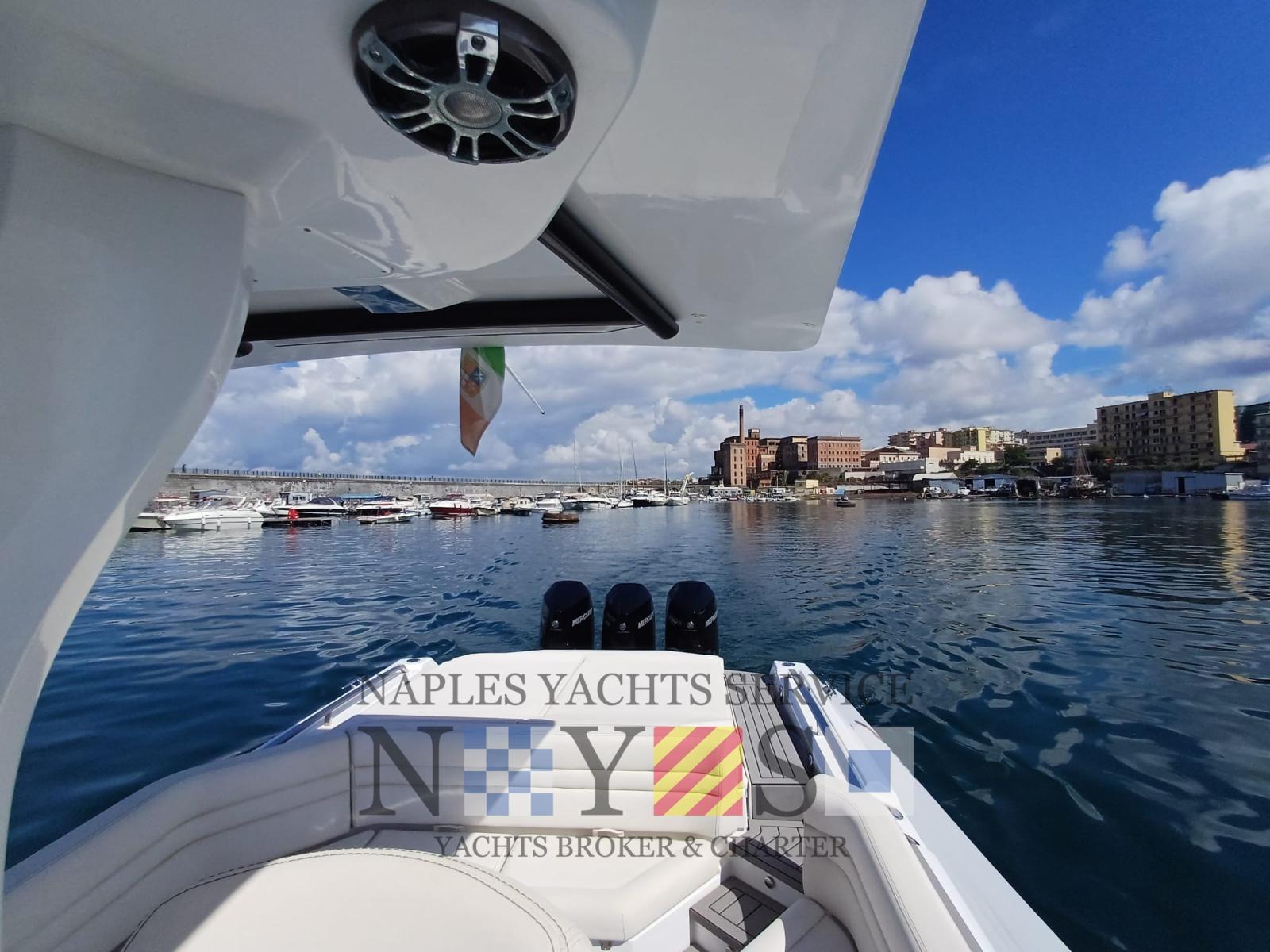 dotazioni di bordo e di sicurezza, tendalino parasole con candelieri, pedana di poppa rivestita in TEAK SINTETICO, telo copri consolle, alza vano gavone di poppa elettro idraulico con alloggio per tavolo pozzetto, gonfiatore elettrico mobile, gavoni controstampati.