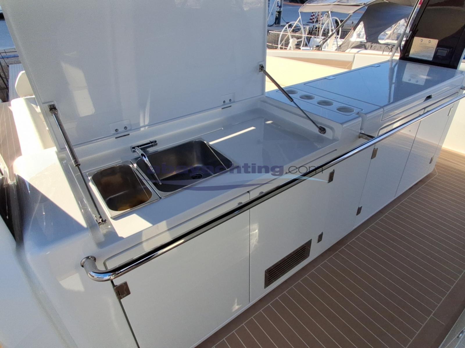 Allarme motore, Autoclave, 4 Batterie (4 x servizi), 2 Bitte Abbattibili (a scomparsa per tender nella plancetta), Camminamenti laterali in teak, Caricabatterie (maggiorato), Doccia esterna, Garage per tender, Luci di cortesia (notturne esterne camminamento), Luci subacquee, Passerella (elettrica telescopica), Piattaforma (Maggiorata con sistema lift), Pompa di sentina automatica, Porta ingresso, Pozzetto Teak, Presa 220V banchina (a murata), Salpa Ancore Elettrico (Con conta catena), Scaletta da bagno, Tavolo pozzetto (Abbattibile), T-Top.