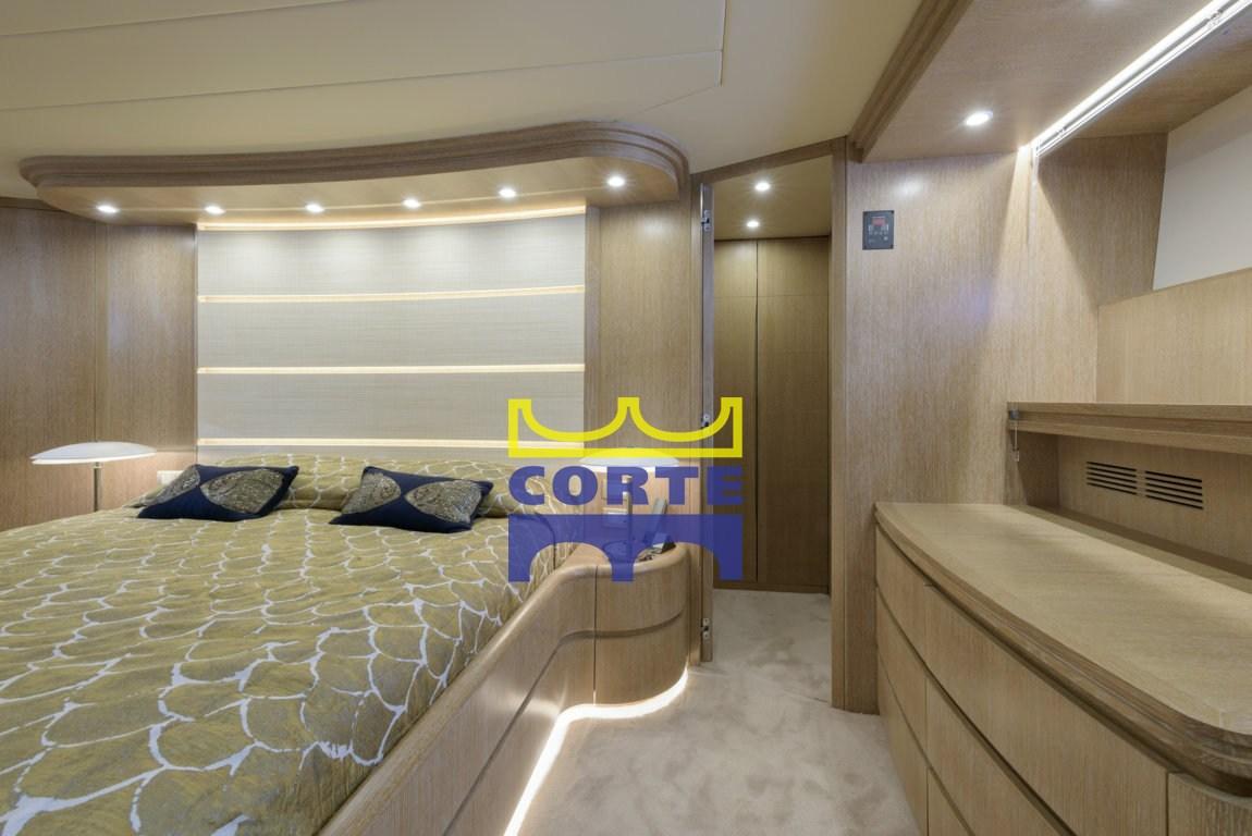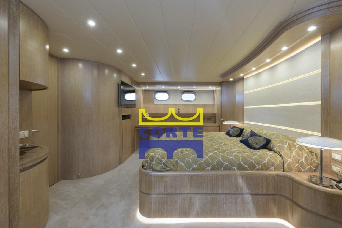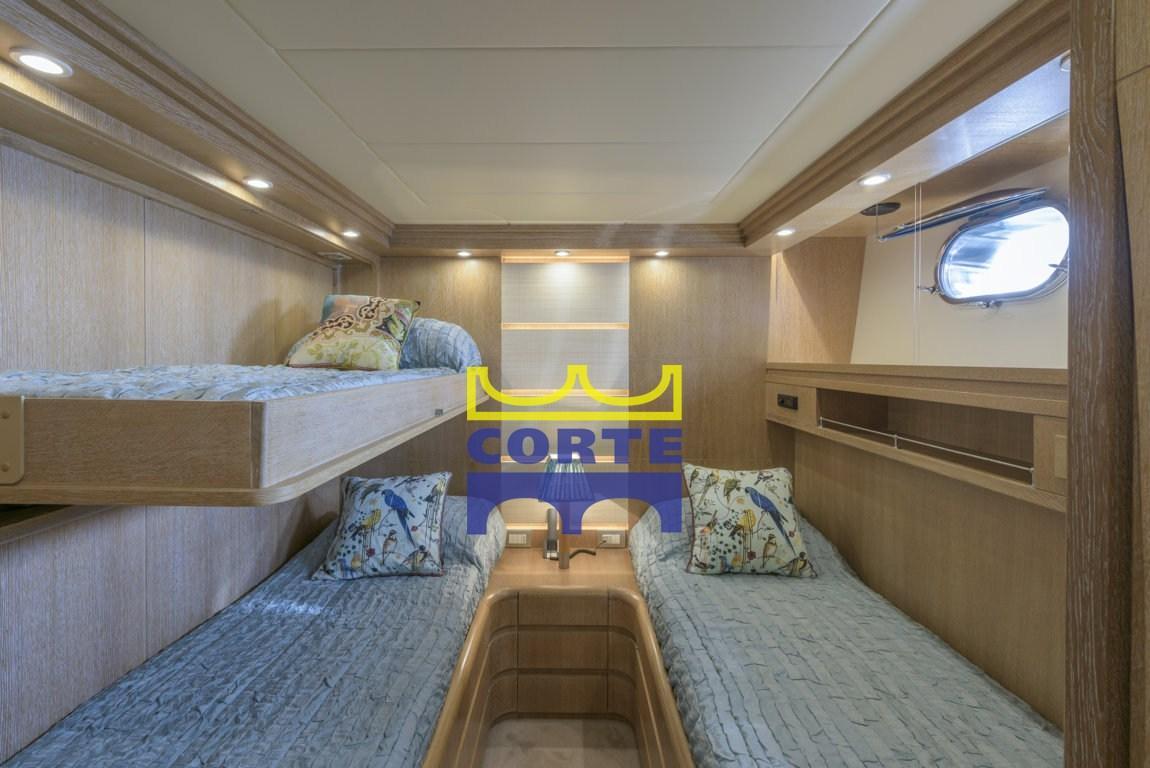 2 cabine ospiti con letti in piano e letto pulman e bagni 3 cabine equipaggio : cabina comandante con bagno con doccia. Due cabine doppie con letti a castello. Bagno marinai. Ampio prendisole a prua. Spazioso pozzetto con tavolo in legno, divanetto e sedie. Pavimento in teak. Fly con pavimento in teak, postazione di guida, tavolo in legno con divanetto e sedie, lettini prendisole, vasca idromassaggio. Tutte le cabine sono provviste di TV.