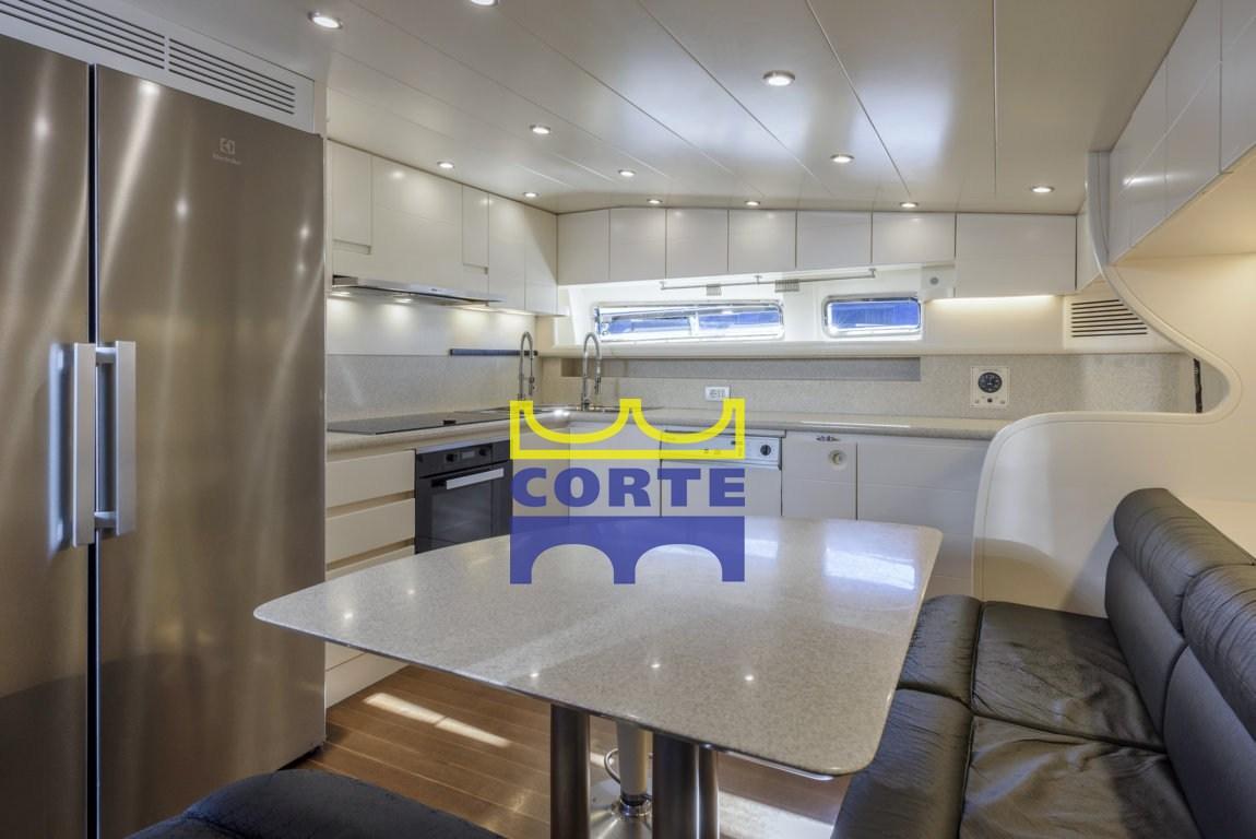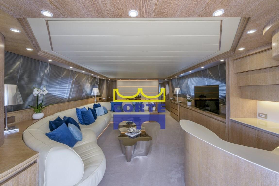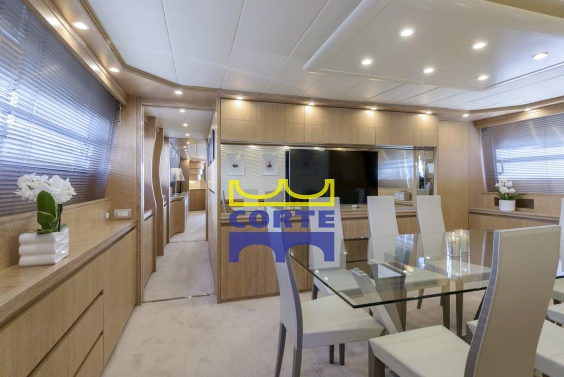Ampio salone con mobile bar, grande divano, tavolini fumo, mobili contenitori, TV, piano di calpestio moquette chiara. Zona pranzo verso prua con tavolo in cristallo, 8 sedie, mobili contenitori e TV. Cucina con dinette per equipaggio e pavimento in legno. Doppio lavello, lavastoviglie Miele, grande piastra cottura, forno, frigo americano. Day toilette
