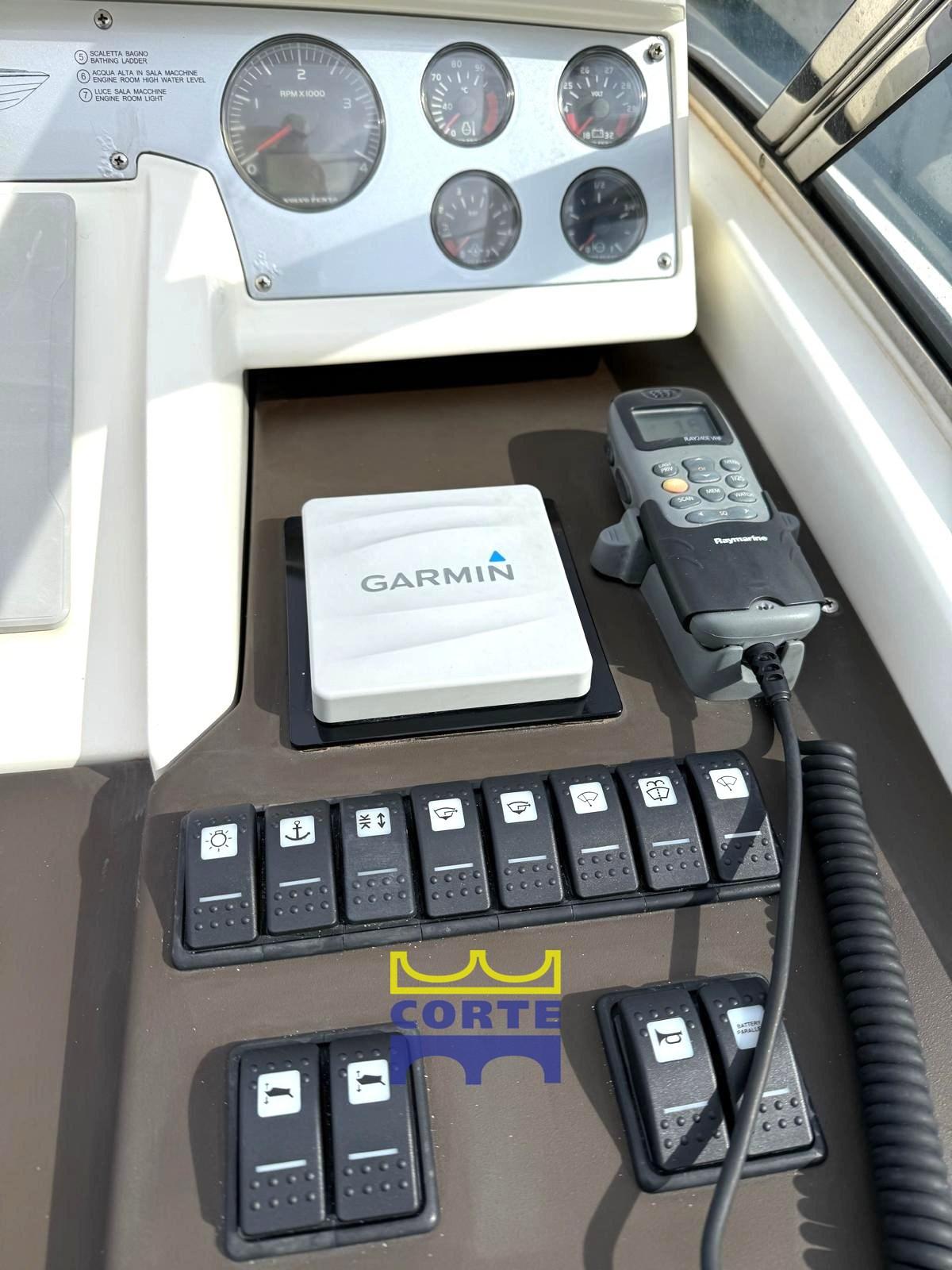 Strumentazione elettronica motori, Joystick manovra; Ecoscandaglio e Log (Raymarine); Plotter-GPS; Pilota automatico (Garmin); VHF; Bussola; Angolo di barra