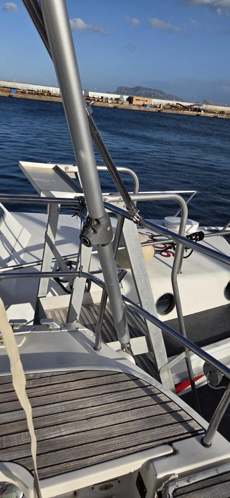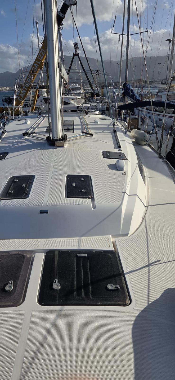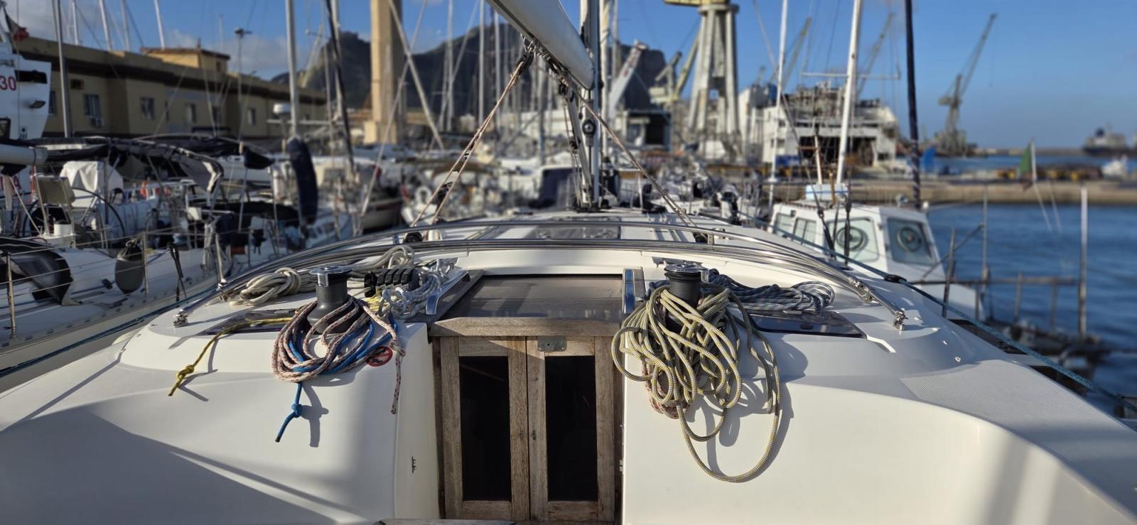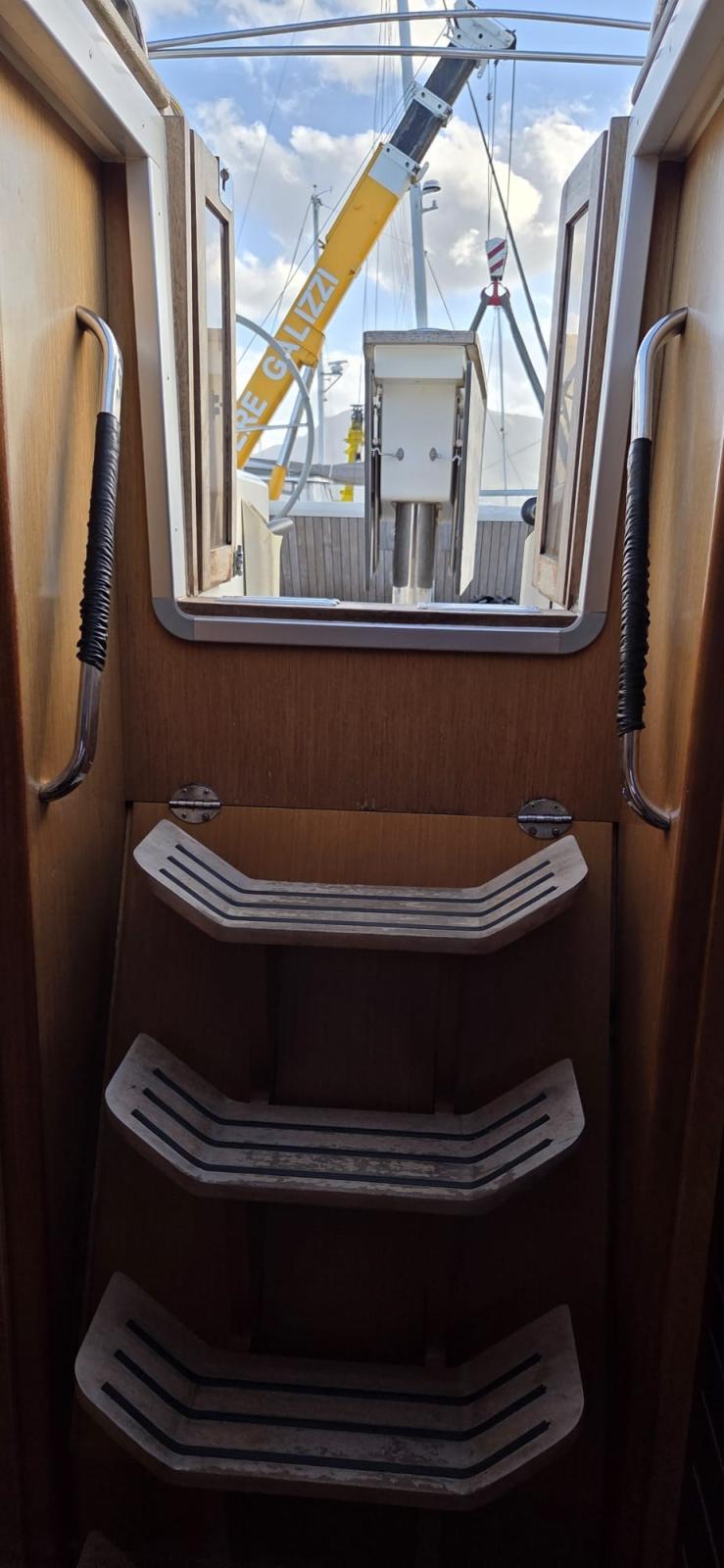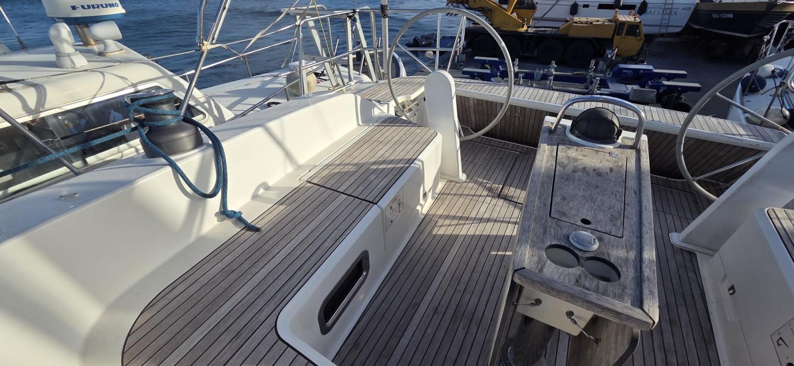 3 Batterie (1x 88 Ah, + servizi 2x 140 Ah), Doccia esterna, Doppia timoneria, 8 Parabordi, Piattaforma (plancette abbattibili), Pompa di sentina manuale, Pozzetto Teak (con tavolino in legno), Salpa Ancore Elettrico, 4 Winch (2 winches drizze con self-tailing, 2 winches scotte genoa con self-tailing, 2 maniglie winches).