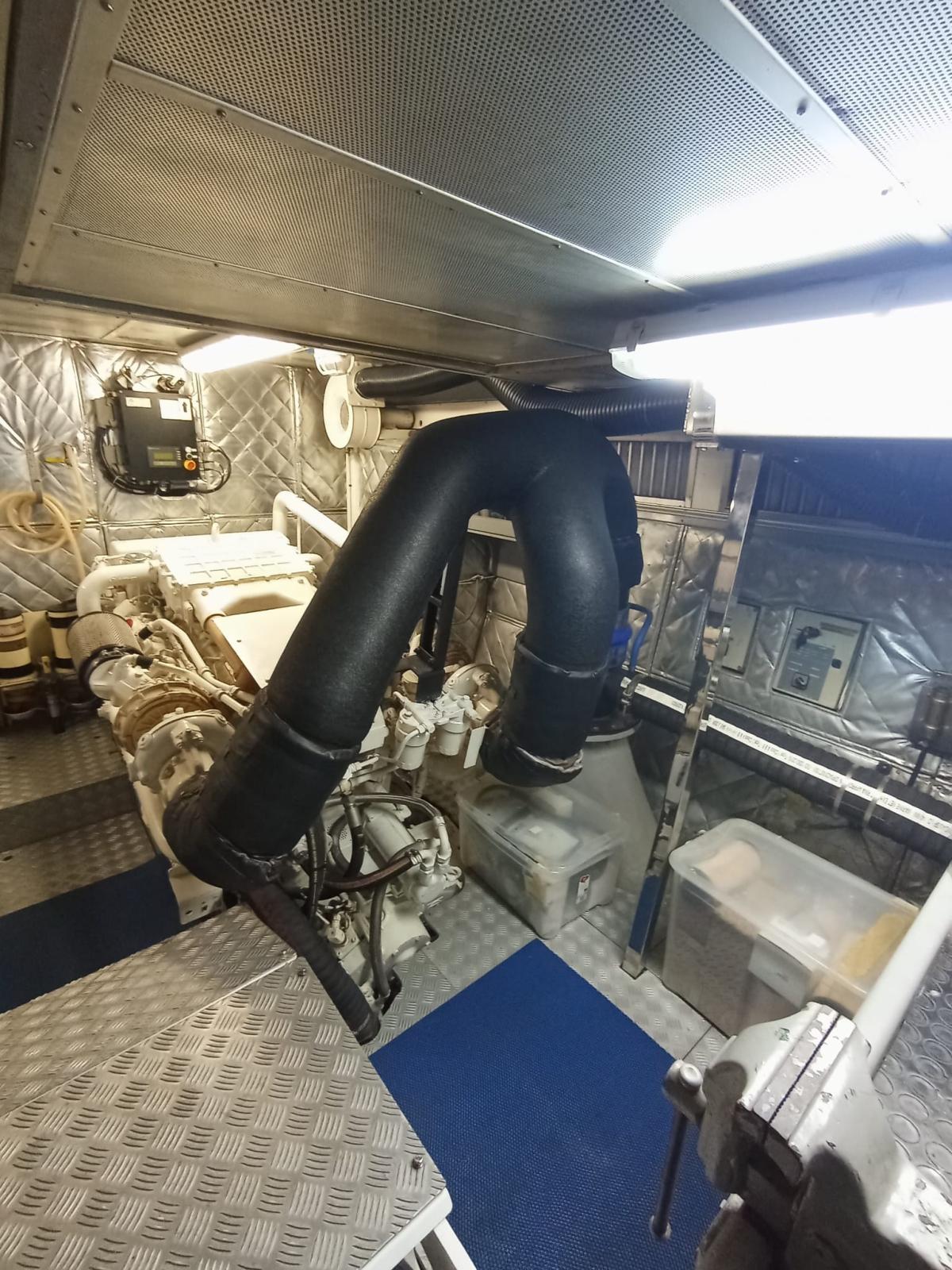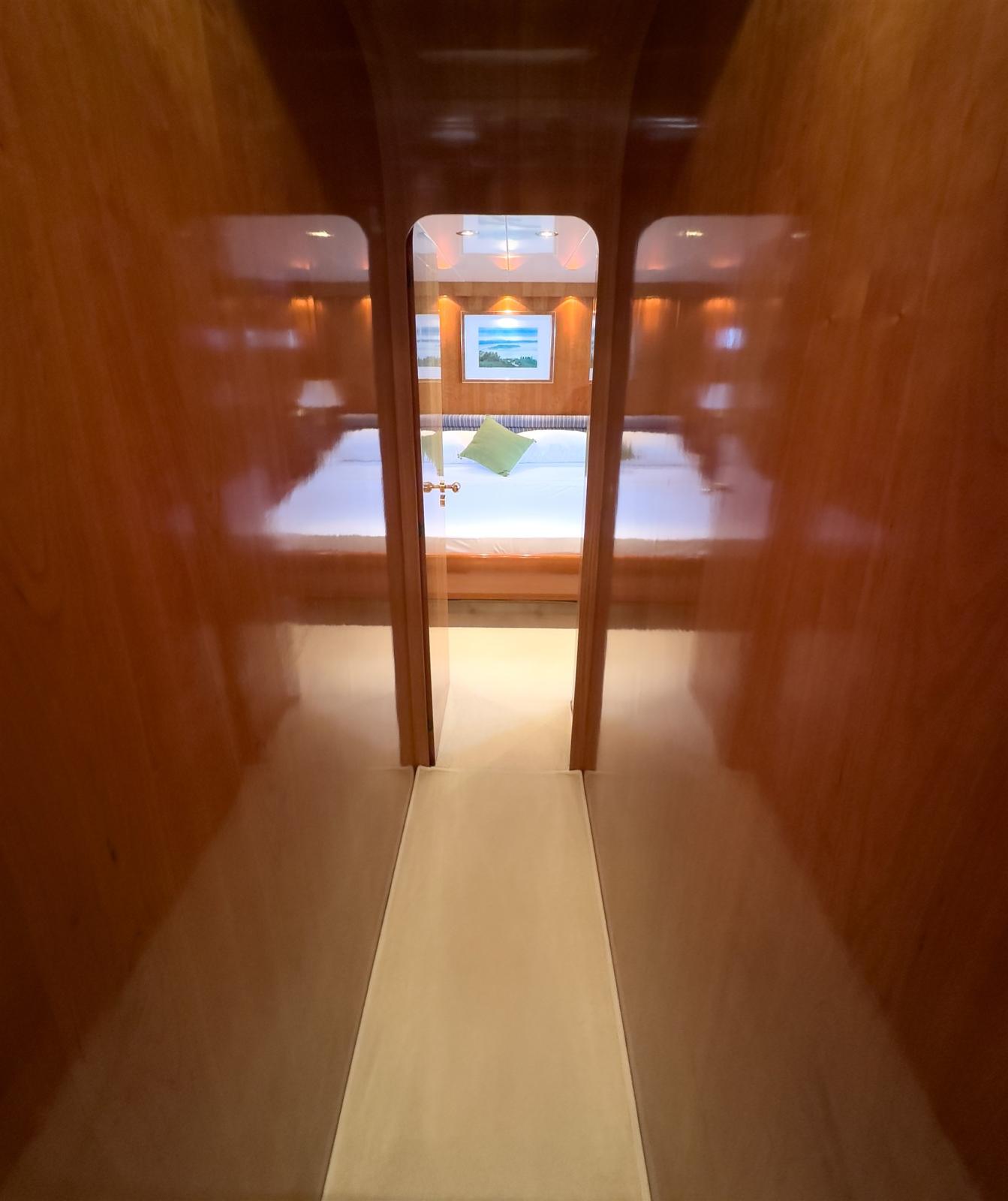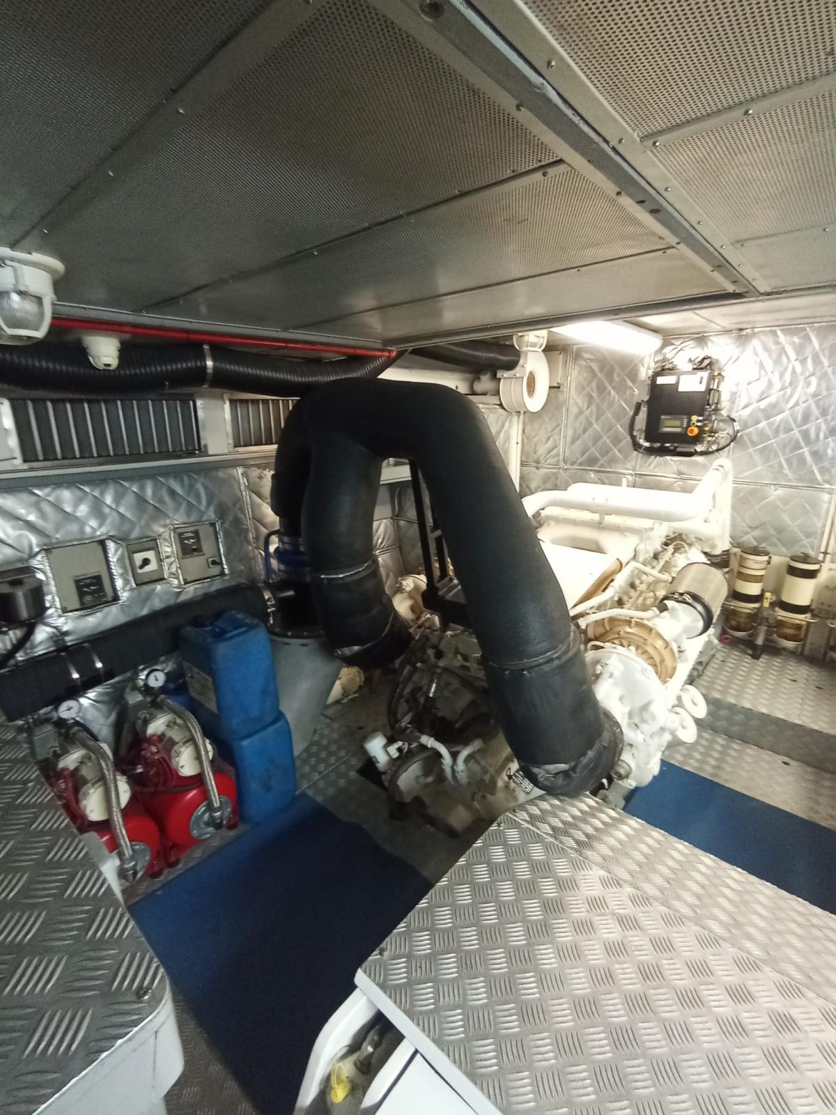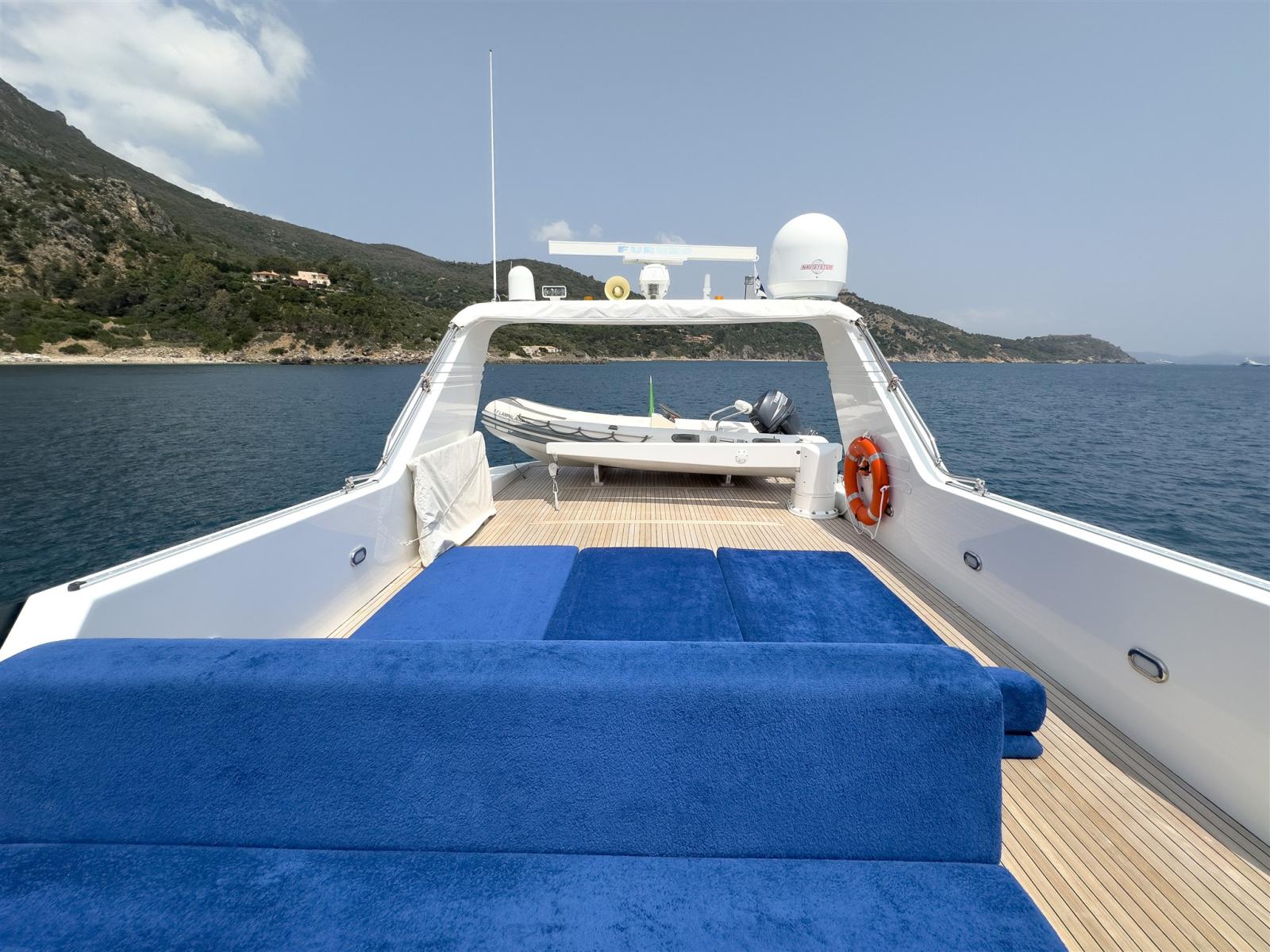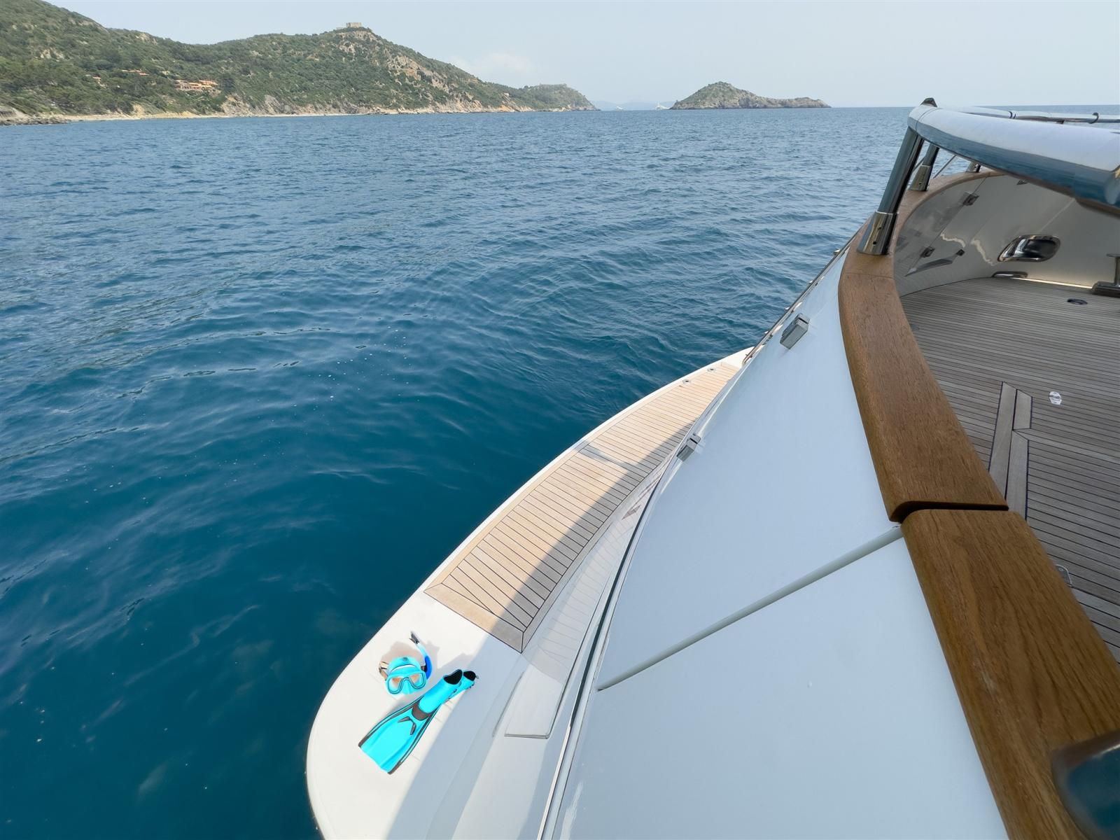 Autoclave, Camminamenti laterali in teak, Doccia esterna (calda e fredda), Doppia timoneria, Gruette per tender su fly, Luci di cortesia, Passerella, Presa 220V banchina, Presa acqua banchina, Scaletta da bagno, Stabilizzatori (Seakeeper 16), Tavolo pozzetto, Tender (Yamaha 40 cavalli, Novamarine 5 metri).