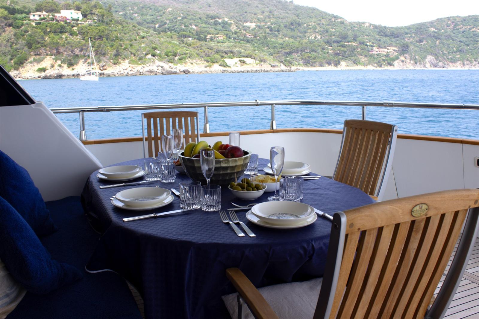 All'esterno troviamo a poppa un tavolo in pozzetto con sedute che può ospitare fino ad 8 persone. A prua troviamo uno spazioso prendisole a cui si accede tramite ampi camminamenti laterali ed un tavolo sul fly per accomodare fino a 4 persone.