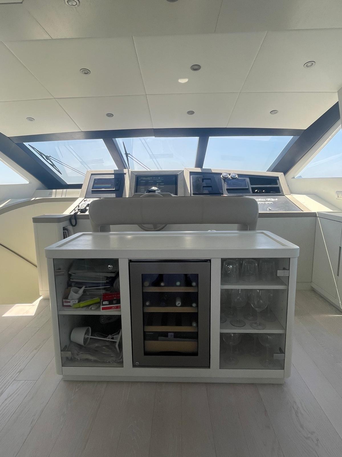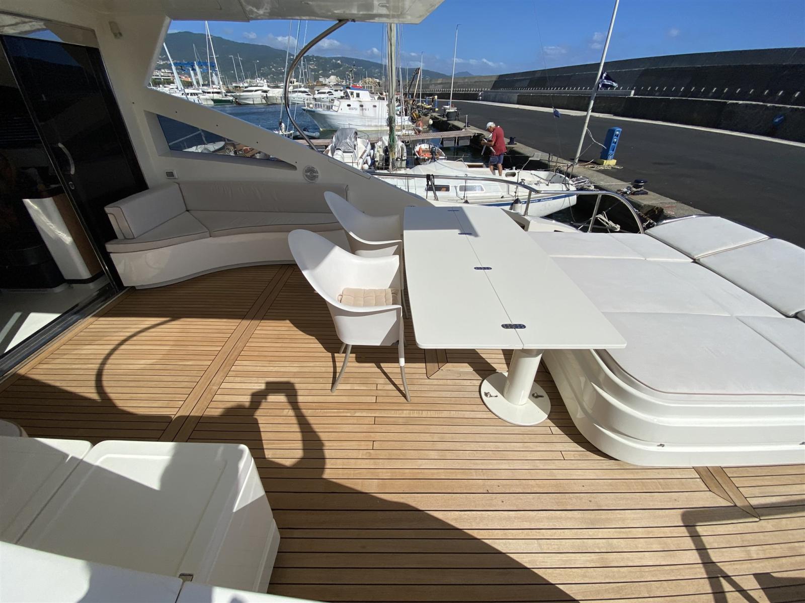 Allarme motore, Allarme sentina, Autoclave, Camminamenti laterali in teak, Doccia esterna, Faro orientabile, Flap idraulici, Garage per tender, Hard top, Impianto antincendio, Indicatori Flaps, Lavaggio catena, Luci di cortesia, Luci subacquee, Passerella, Piattaforma, Pompa di sentina automatica, Pompa di sentina manuale, Porta ingresso, Porta laterale, Pozzetto Teak, Presa 220V banchina, Presa acqua banchina, Rollbar, Salpa Ancore Elettrico, Scaletta da bagno, Tavolo pozzetto, Tientibene con cancelletti, Tromba, 2 Winch tonneggio di poppa.