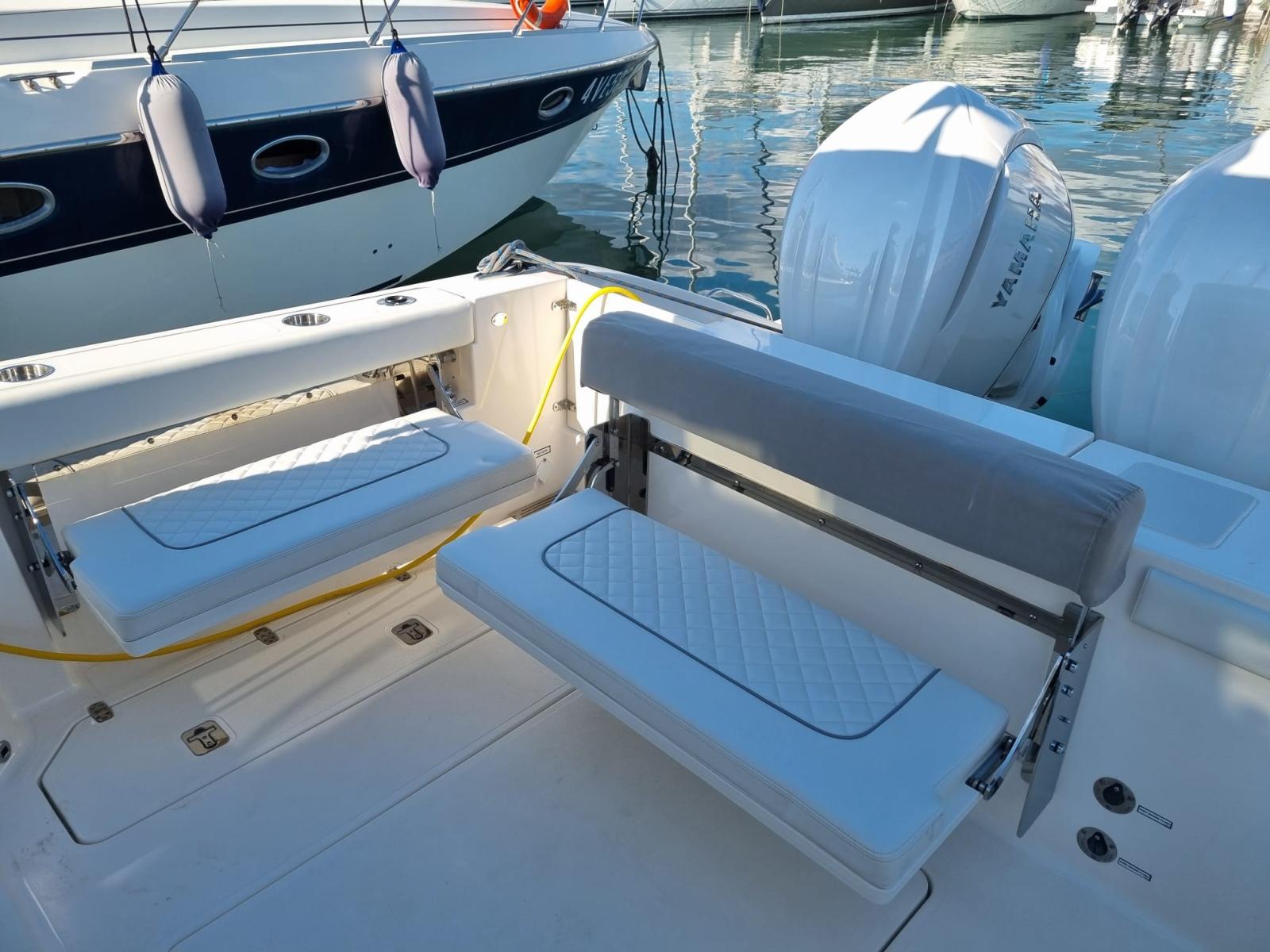Allarme motore, Allarme sentina, Alternatore, Ancora (CON 75 METRI CATENA INOX 316L), Autoclave, Cavo corrente di banchina, Doccia esterna, Flap elettrici, Indicatori Flaps, Lavandino nel Pozzetto, Luci di cortesia, Luci subacquee (RGB), Piattaforma, Pompa di sentina automatica, Pompa di sentina manuale, Porta laterale (+ SCALETTA TIPO "SCUBA DIVING"), Pozzetto Teak (SINTETICO), Presa 220V banchina, Salpa Ancore Elettrico, Scaletta da bagno, Tavolo pozzetto, Tromba.