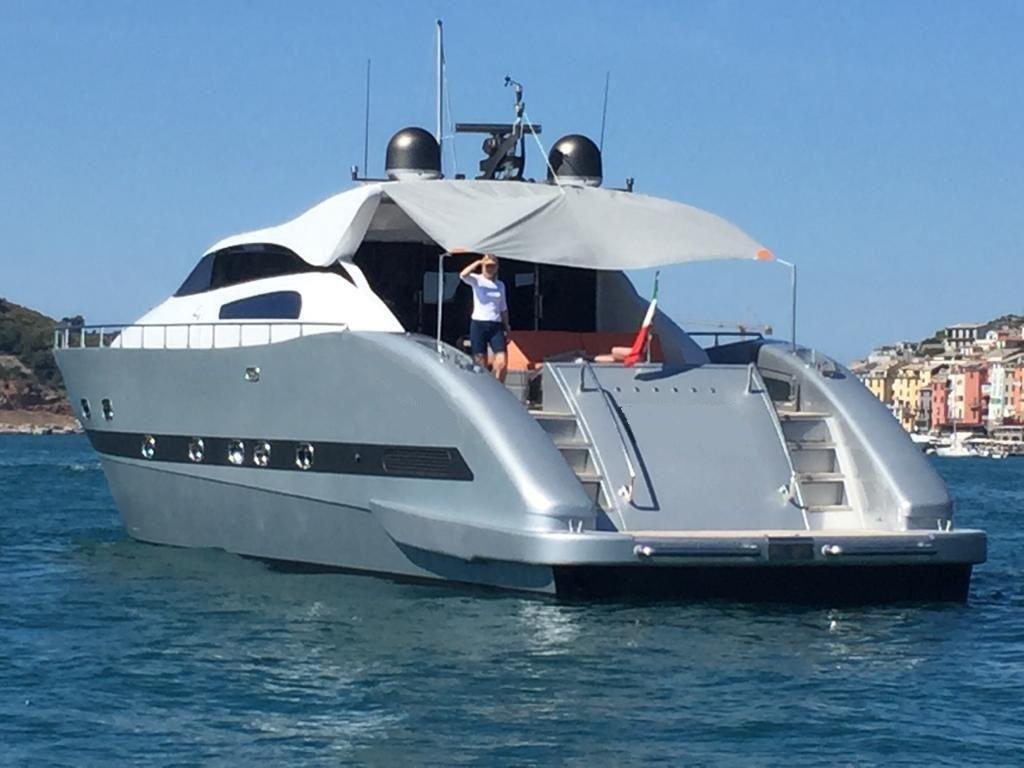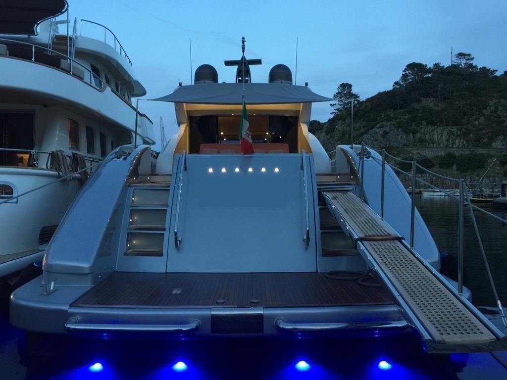 Allarme fumo/gas, Allarme motore, Allarme sentina, Alternatore, Autoclave, Camminamenti laterali in teak, Cavo corrente di banchina, Colorazione speciale (ARGENTO METALLIZZATO), Corrimano, Doccia esterna, Flap idraulici, Garage per tender, Gruette per tender, Hard top, Impianto antincendio, Indicatori Flaps, Luci di cortesia, Luci subacquee, Passerella, Piattaforma, Pompa di sentina automatica, Pompa di sentina manuale, Ponte in teak, Porta ingresso, Porta laterale, Pozzetto Teak, Presa 220V banchina, Salpa Ancore Elettrico, Scaletta da bagno, Tavolo pozzetto, Tientibene con cancelletti, Tromba, Winch tonneggio di poppa.