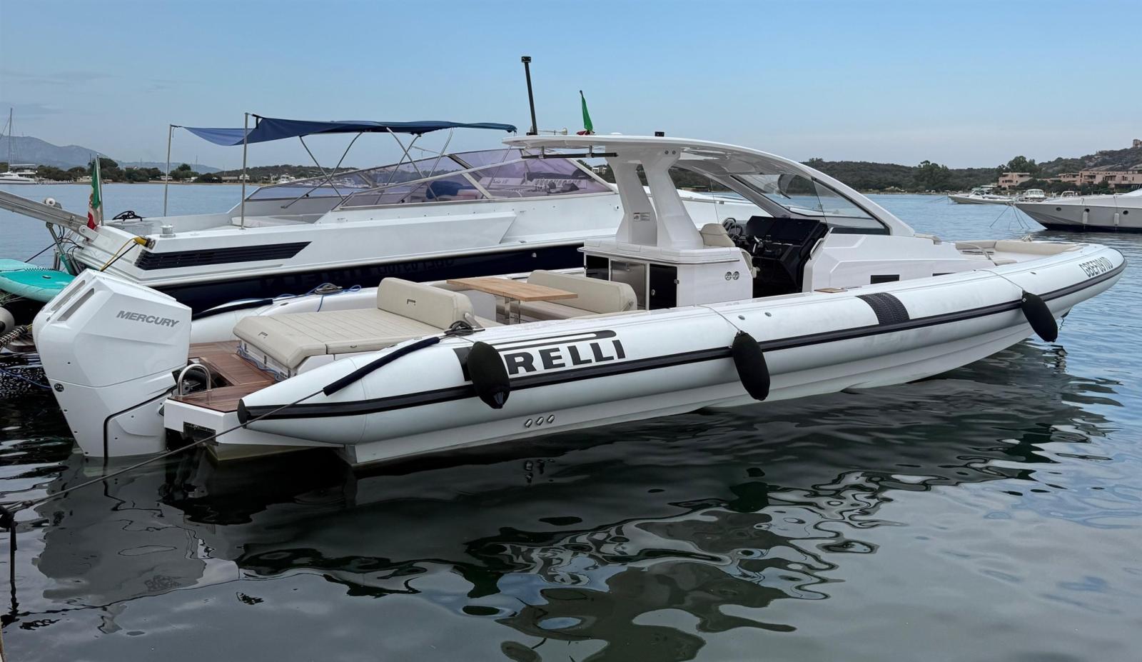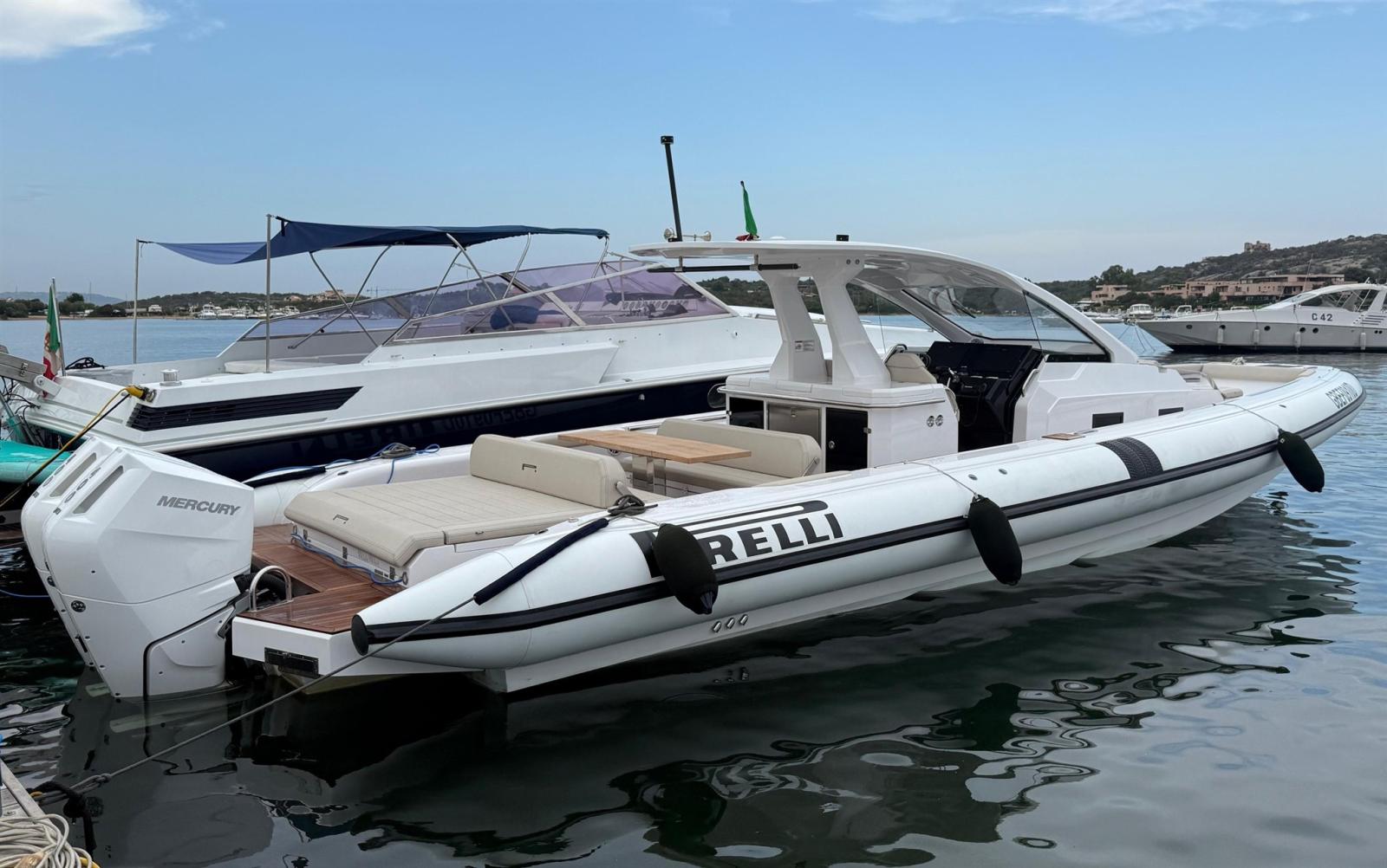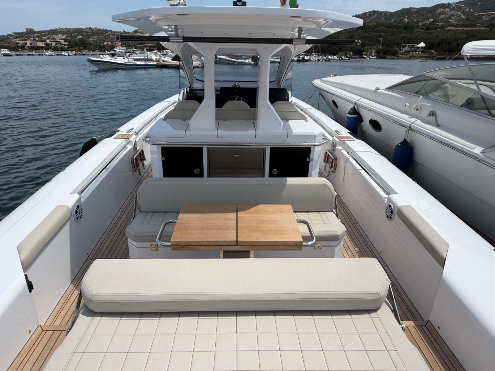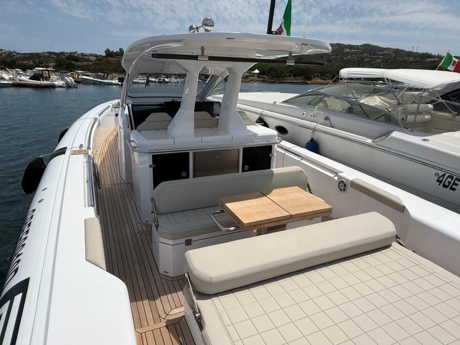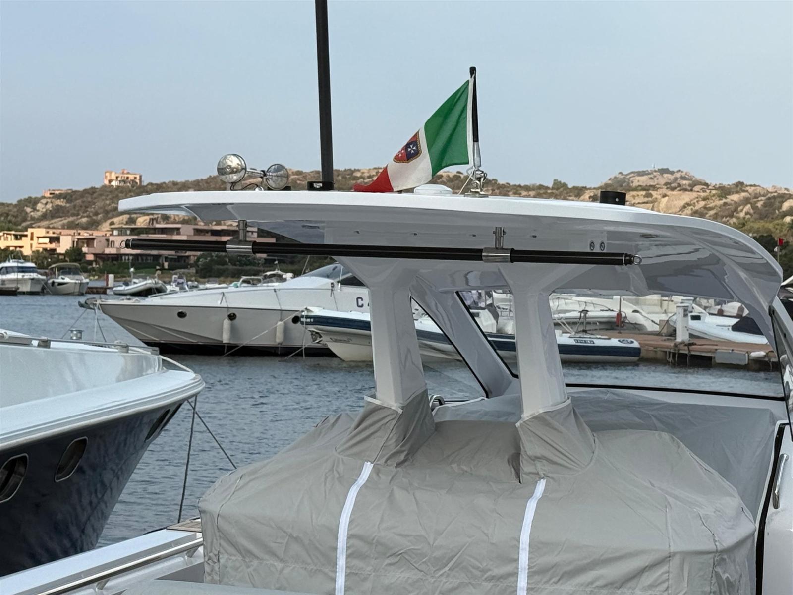 Allarme motore, Allarme sentina, Alternatore, Ancora (e catena in inox), Autoclave, Bitte Abbattibili, Camminamenti laterali in teak, Cavo corrente di banchina, Doccia esterna, Lavandino nel Pozzetto, Luci di cortesia, Luci subacquee, Piattaforma, Pompa di sentina automatica, Pompa di sentina manuale, Ponte in teak, Pozzetto Teak, Presa 220V banchina, Salpa Ancore Elettrico, Scaletta da bagno (+ seconda scaletta aggiuntiva), Tavolo pozzetto, Tromba, T-Top (con prolunga in carbonio).