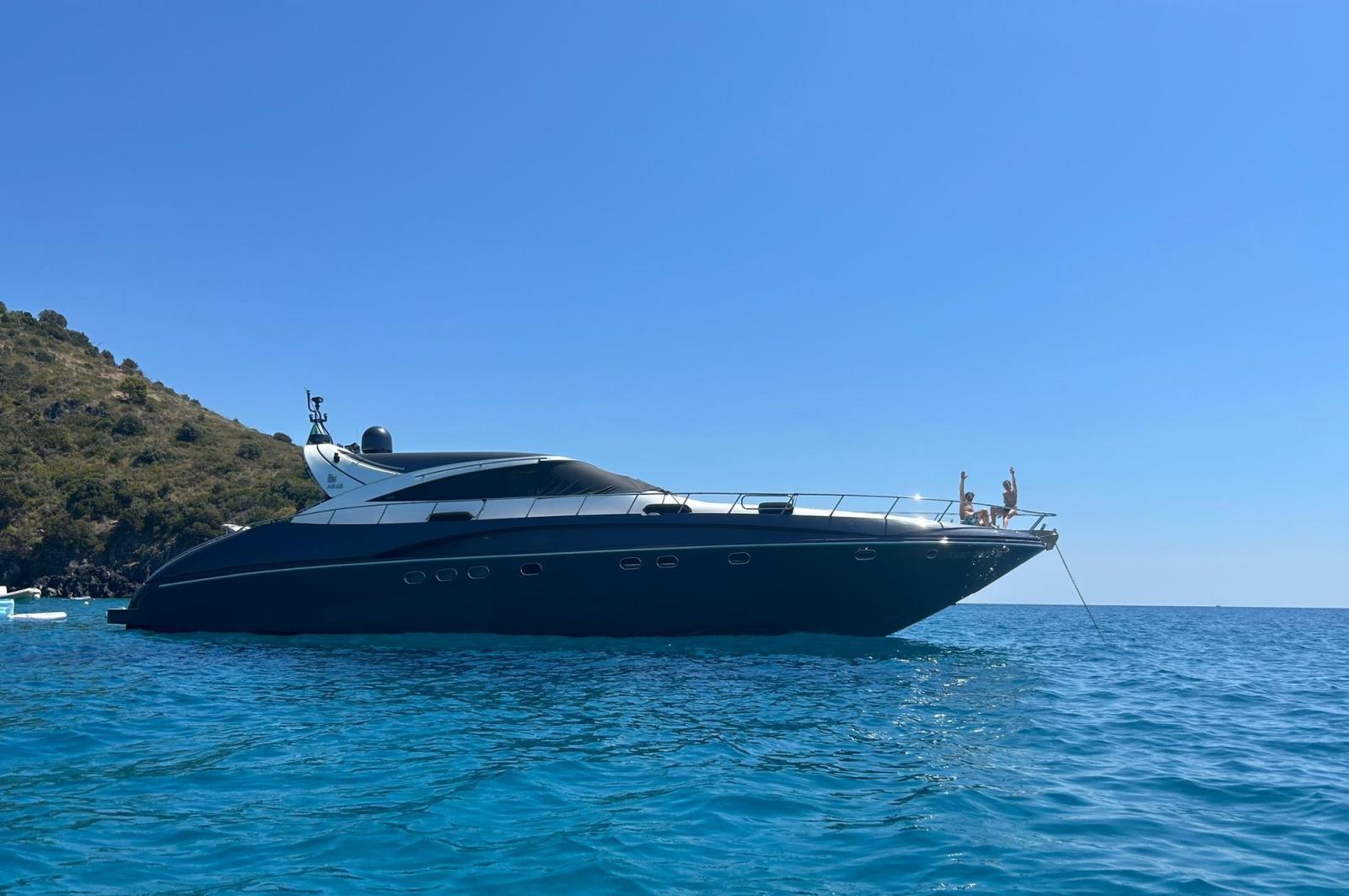 Allarme motore, Autoclave, Colorazione speciale (Grigio scuro), Doccia esterna, Faro orientabile, Flap idraulici, Garage per tender, Gruette, Hard top, Indicatori Flaps, Lavandino nel Pozzetto, Luci di cortesia, Passerella, Piattaforma, Pompa di sentina manuale, Porta ingresso, Pozzetto Teak, Presa 220V banchina, Raddrizzatore, Rollbar, Salpa Ancore Elettrico, Scaletta da bagno, Tavolo pozzetto, Tromba, Winch tonneggio di prua.
