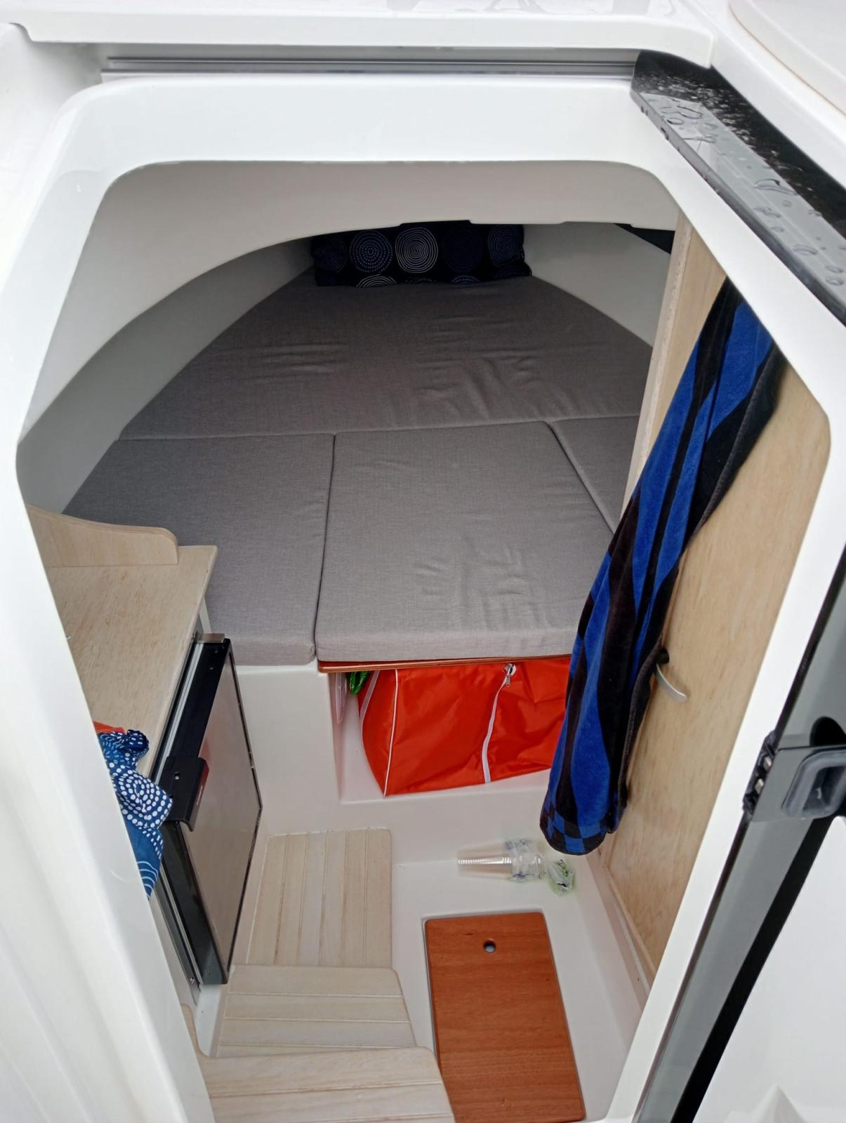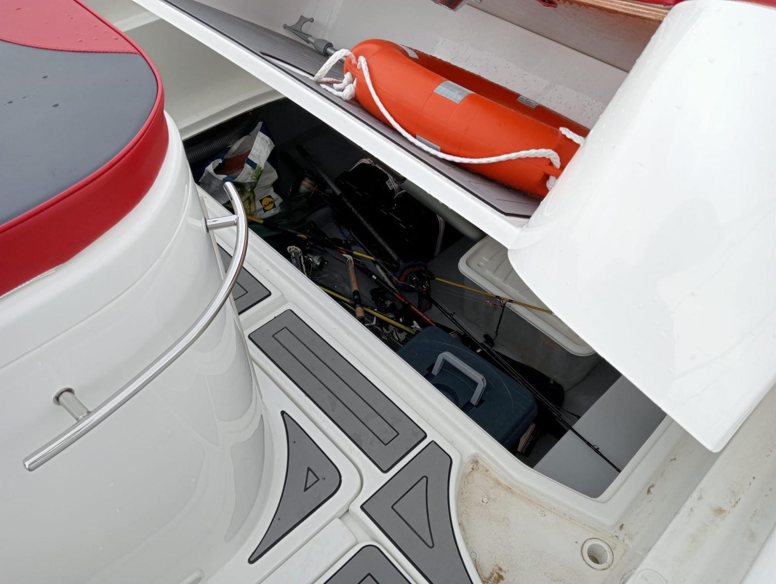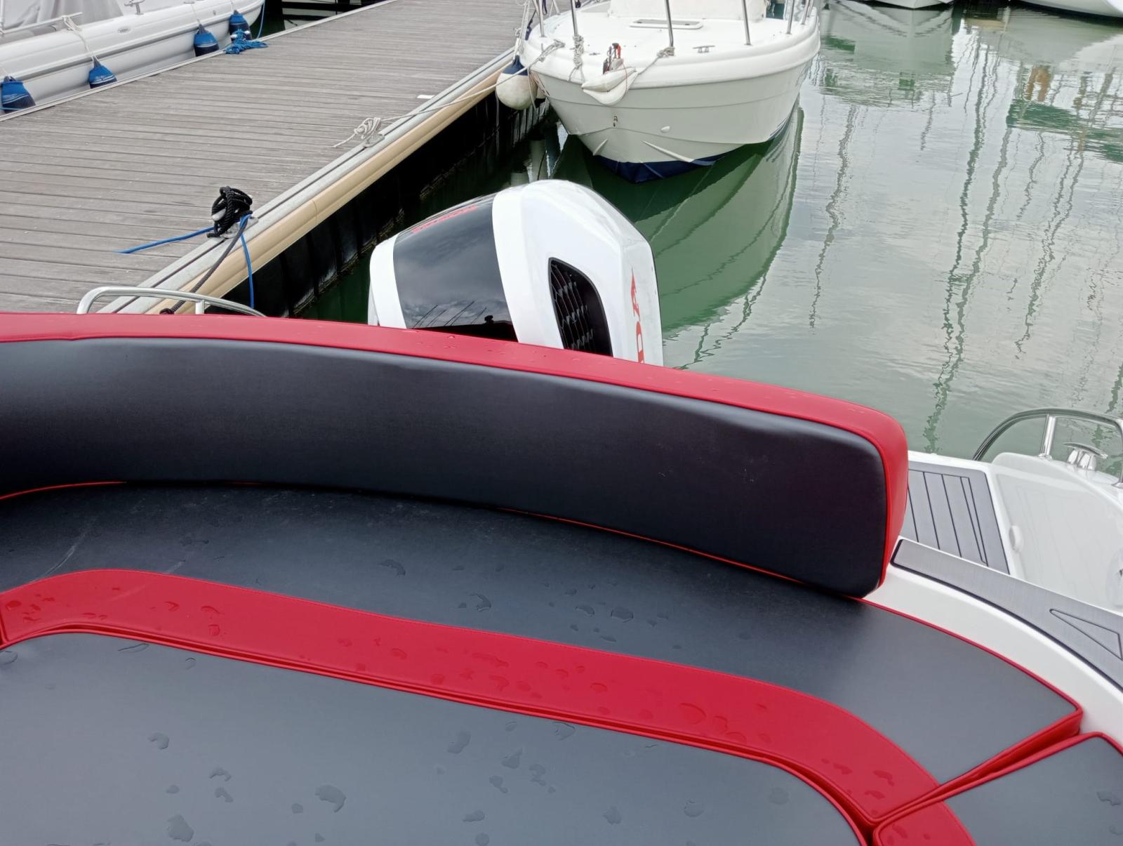 comoda cabina interna con bagno separato, cuscineria completa interna ed esterna, ampio gavone a poppa con apertura elettrica.