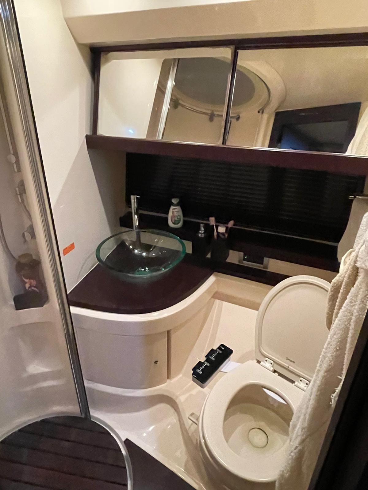 Cabina armatoriale a prua con finestratura laterale e bagno interno con box doccia separato.
