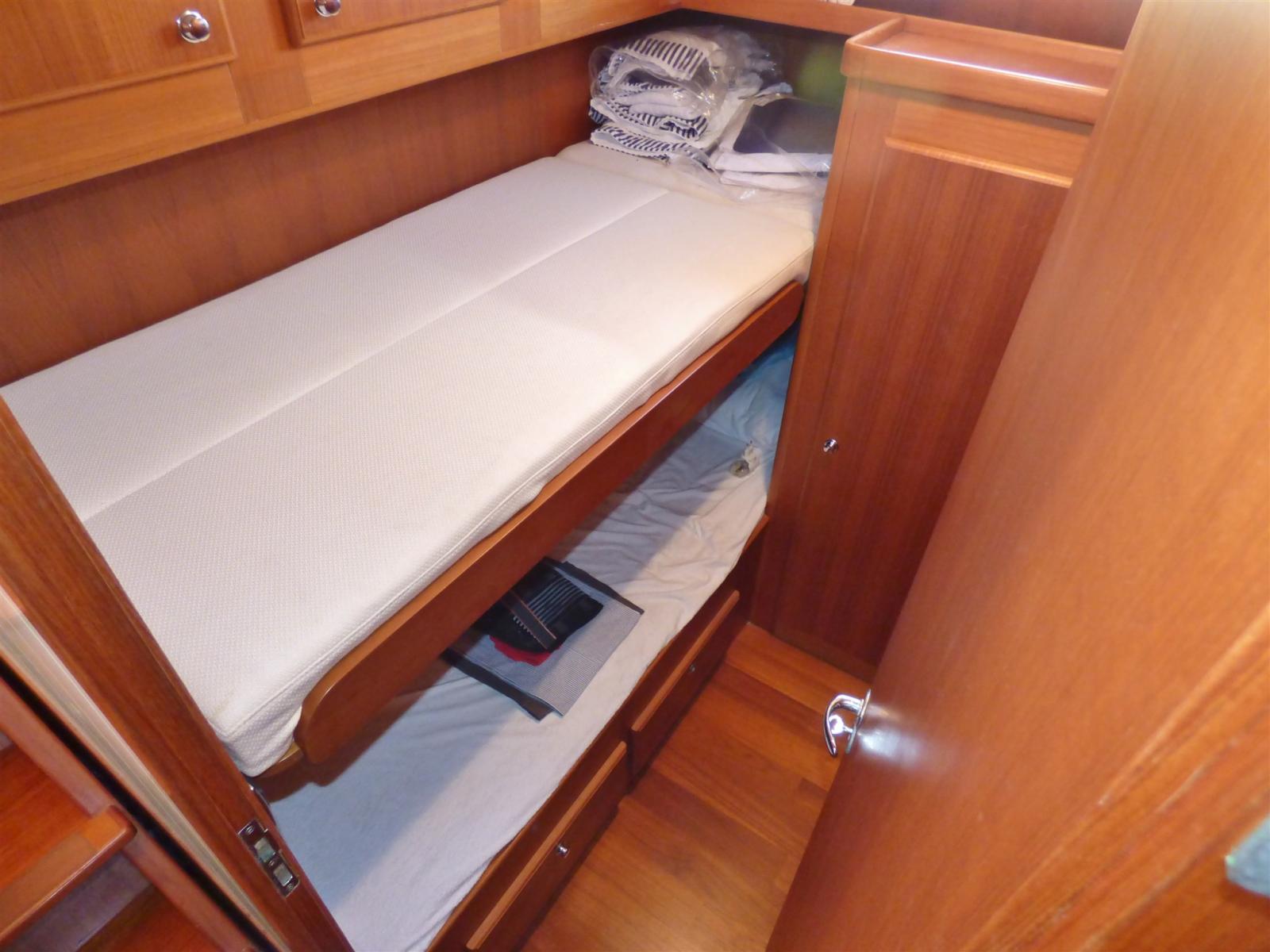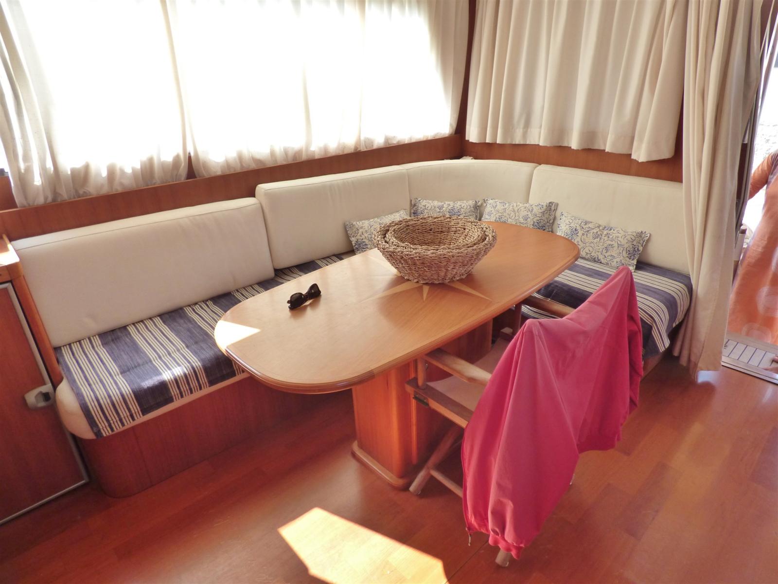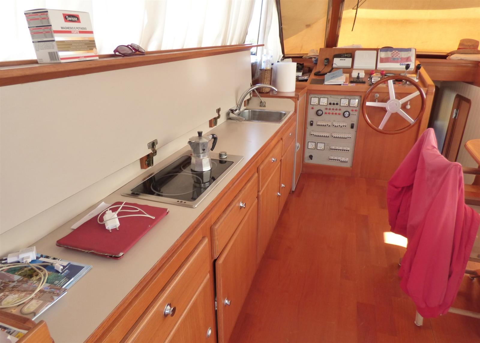 Boiler, Dissalatore (da 120 lt/h), Pavimento interno in legno, Prese interne 12v, Prese interne 220v, 2 WC marino elettrico, WC marino manuale (cabina marinaio).
