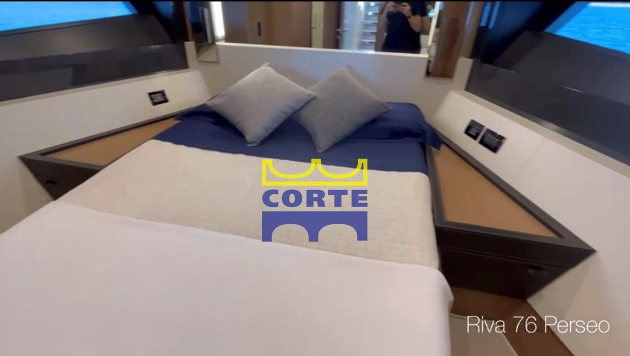 Cabina armatoriale matrimoniale a centro barca con bagno con doppio lavandino e ampia doccia.