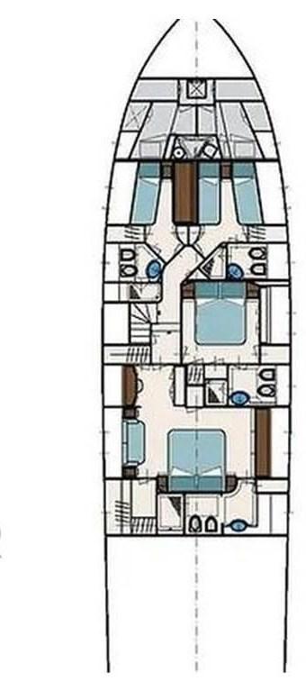 2 Matrimoniale italiana, 1 Doppia in piano, 1 Singola, 4 Toilette con doccia, 1 Cucina, 1 Salone - cabina marinaio