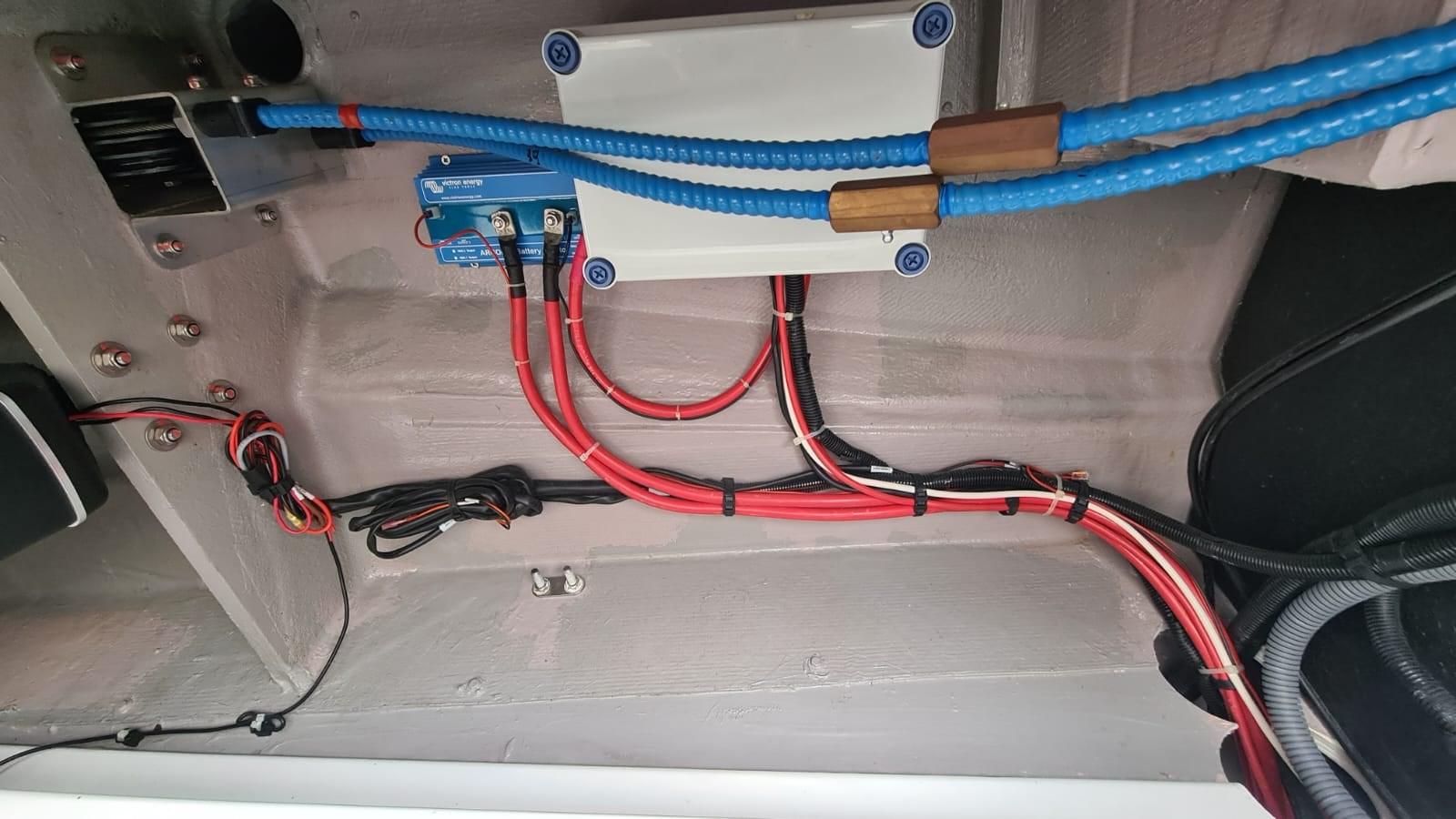 Allarme motore, Autoclave, 8 Batterie (2 motore+ 6 servizi), Doccia esterna, Gruette per tender, Luci di cortesia, 2 Pannelli Solari (900 watt), Piattaforma, Pompa di sentina automatica, Porta ingresso, Presa 220V banchina, Presa acqua banchina, Ripetitore strumentazione, Salpa Ancore Elettrico (Lofrans'), Sartiame spiroidale, Scaletta da bagno, Tavolo pozzetto, Tender, 4 Winch, Winch Elettrico (sul fly).
