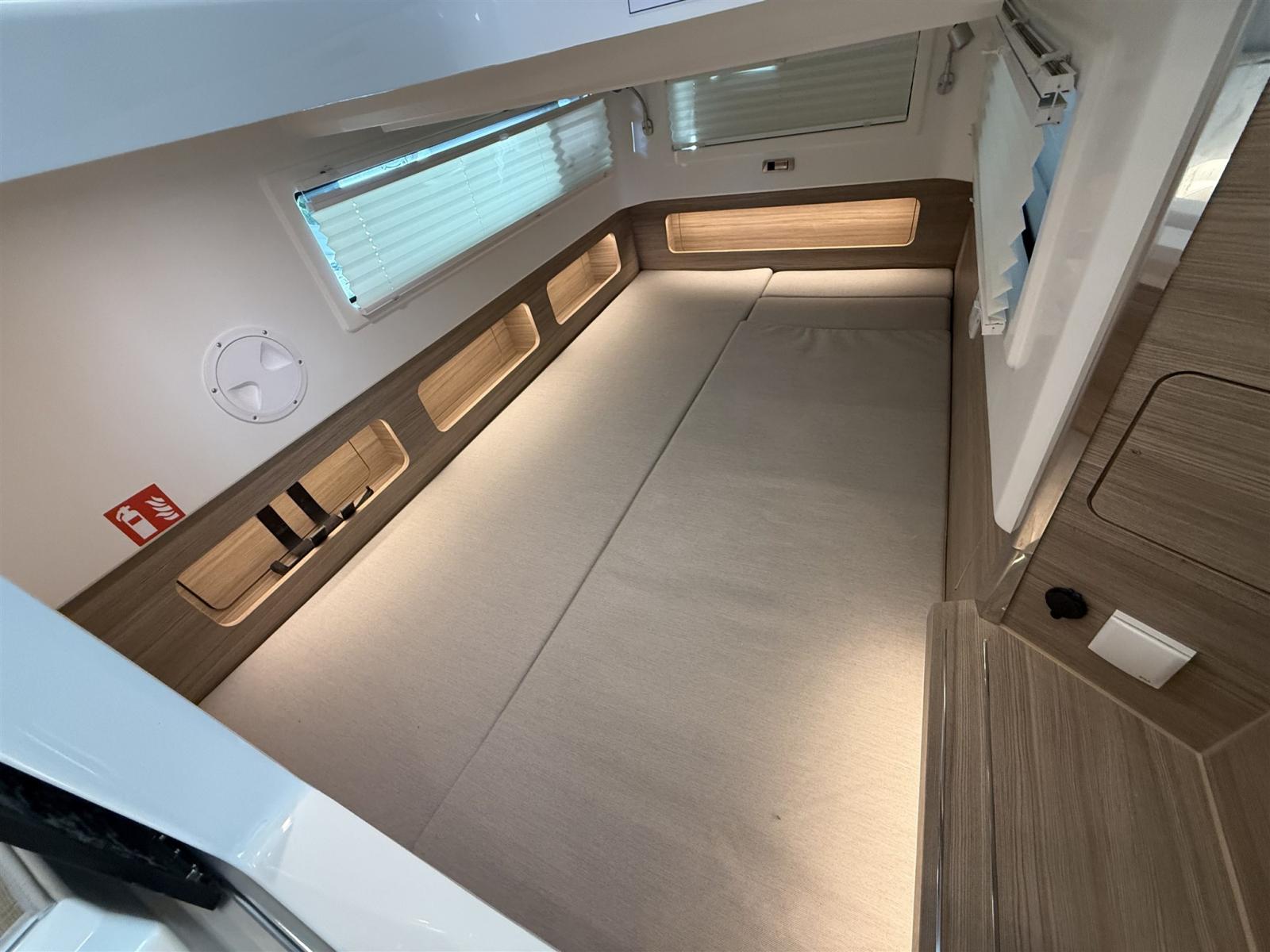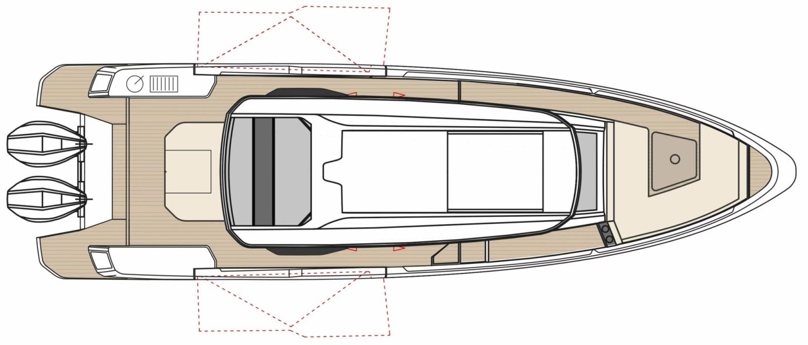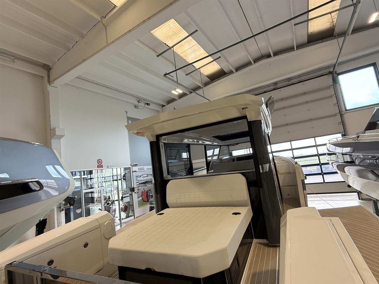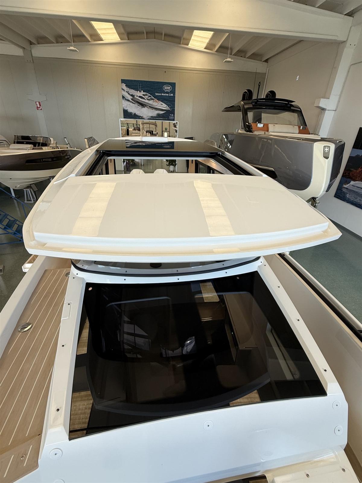 Barca configurata full optional: motori 2x300 Mercury bianchi, aria condizionata con inverter e batterie al litio, flexiteek, elica di prua, tetto apribile elettrico, allestimento cabina di poppa, flaps automatici zipwake, barbecue di poppa, frigo, navigation package, cancelletti di poppa.