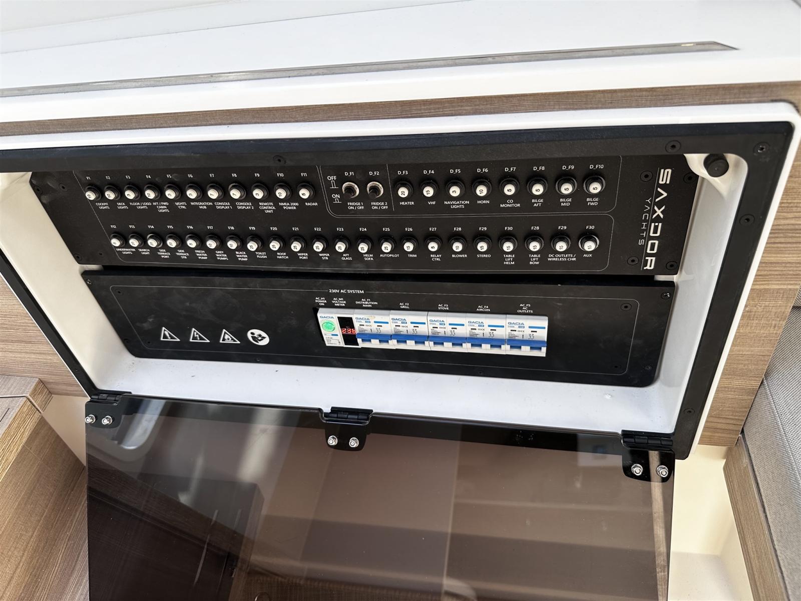 Allarme motore, Autoclave, Camminamenti laterali in teak (flexiteek), Doccia esterna, Flap elettrici (zipwake automatici), Hard top, Indicatori Flaps, Lavandino nel Pozzetto, Luci subacquee, 2 Piattaforma (laterali apribili), Pompa di sentina automatica, Pozzetto Teak (flexiteek), Presa 220V banchina, Salpa Ancore Elettrico, Scaletta da bagno, Tavolo pozzetto, Tavolo Salone Abbattibile, Tromba.