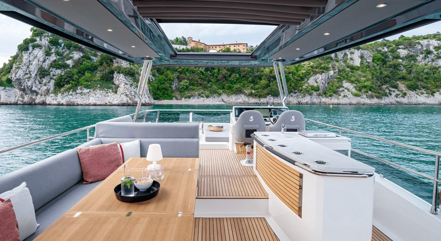 Autoclave, Doccia esterna, Doppia timoneria, Impianto antincendio, Indicatori Flaps, Passerella, Piattaforma, Porta laterale, Pozzetto Teak, Presa 220V banchina, Presa acqua banchina, Salpa Ancore Elettrico, Scaletta da bagno, Tromba, Winch tonneggio di poppa.