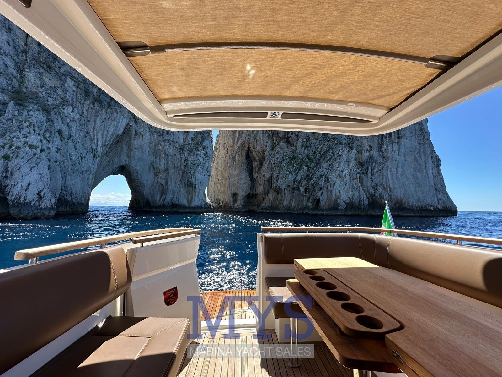 Linee moderne, pozzetto intelligente con chiusura totale a tendalini integrati, spazi ottimizzati e finiture di livello premium: è una barca progettata per offrire comfort reale, non solo estetica.