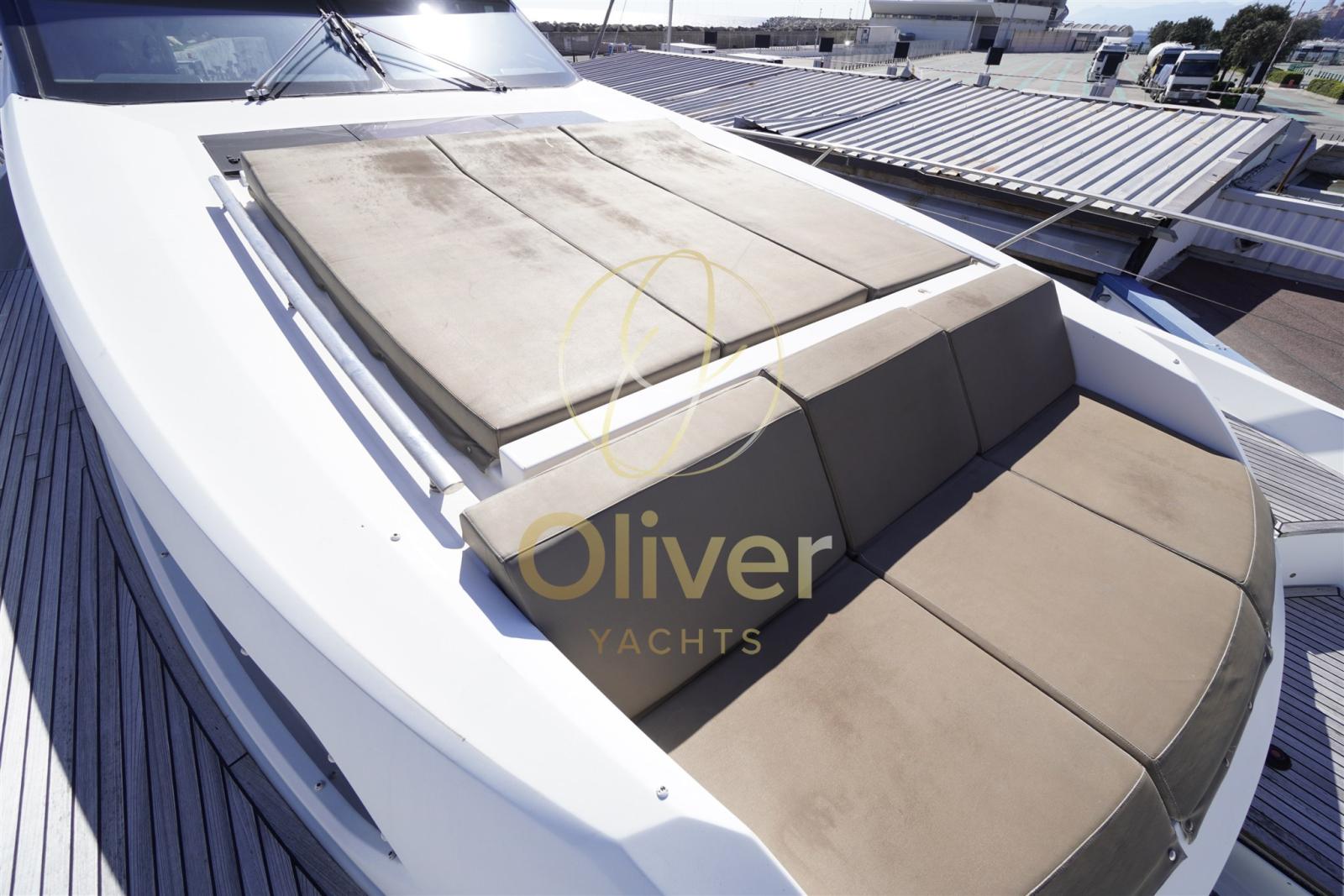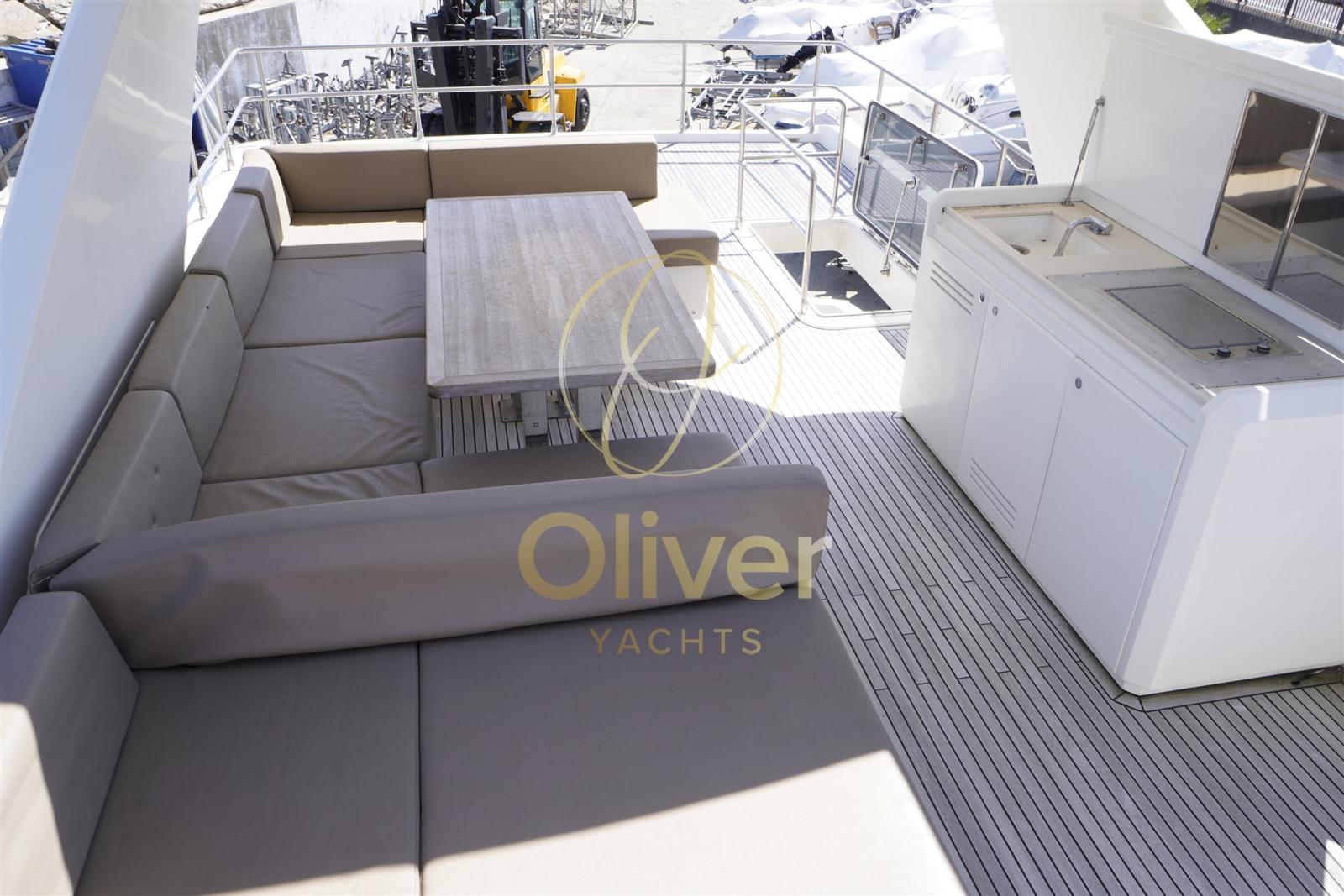 Il flybridge è un vero secondo salone open air, con zona dining, prendisole e area lounge. Gli spazi esterni sono ampi, sfruttabili e pensati per la convivialità.