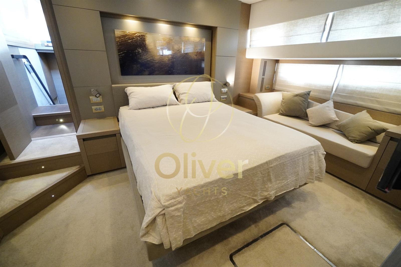 La cabina armatoriale full beam, che si trova a prua sul ponte principale, è il punto di forza: spaziosa, con letto centrale, armadi capienti e bagno privato con doccia separata. La cabina VIP anch'essa full beam a centro barca offre volumi generosi e finiture di livello, mentre le due cabine ospiti con letti singoli completano un layout a quattro cabine ben equilibrato. In totale sono presenti tre bagni dedicati, oltre alla cabina equipaggio separata a poppa.