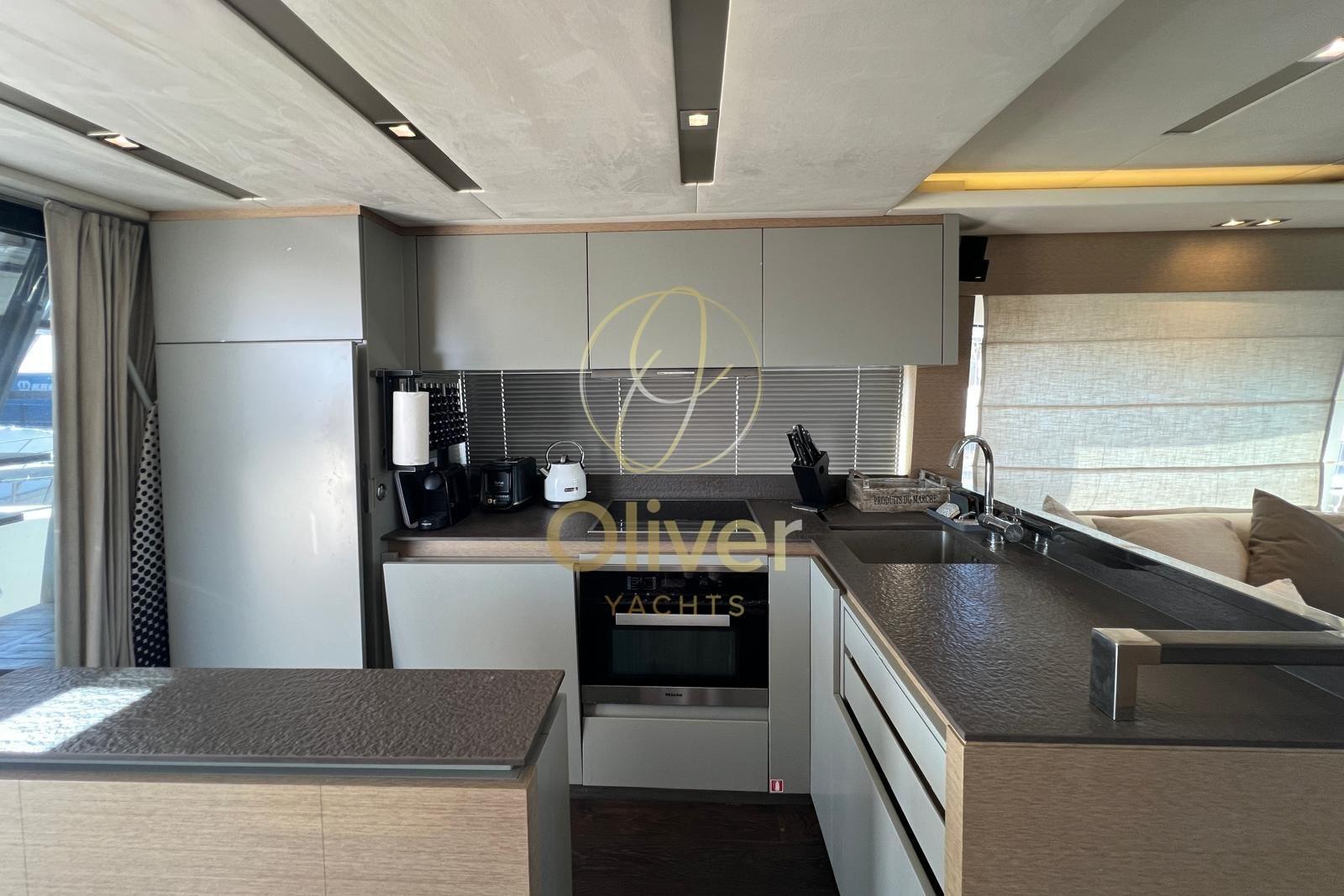 La cucina è completamente attrezzata con freezer, microonde e elettrodomestici moderni, pensata per permanenze prolungate a bordo. Materiali, finiture e falegnameria mantengono uno standard elevato, con uno stile contemporaneo che non mostra segni di invecchiamento.
