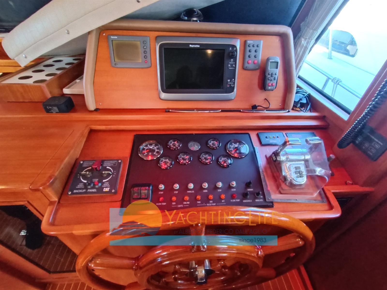 Allarme motore, Allarme sentina, Autoclave, Doccia esterna, Doppia timoneria, Faro orientabile, Flap idraulici, Gruette per tender su fly, Indicatori Flaps, Luci di cortesia, Passerella, Pompa di sentina automatica, Pozzetto Teak, Presa 220V banchina, Salpa Ancore Elettrico, Scaletta da bagno, Tavolo pozzetto, Tromba, Winch tonneggio di poppa.