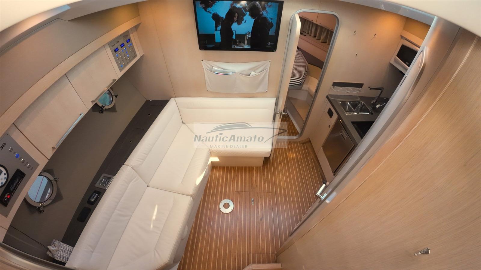 Tante le soluzioni intelligenti adottate, tra cui uno dei più grandi pozzetti esterni della categoria, pensato con un generoso divano a “C” da 8 posti integrabile con un tavolo a comando elettro-pneumatico che alla necessità e grazie ad un prolunga ed un cuscino (non presente), diventa un grande prendisole di poppa che va ad aggiungersi a quello già molto generoso di prua, pensato anche con gli schienali reclinabili!