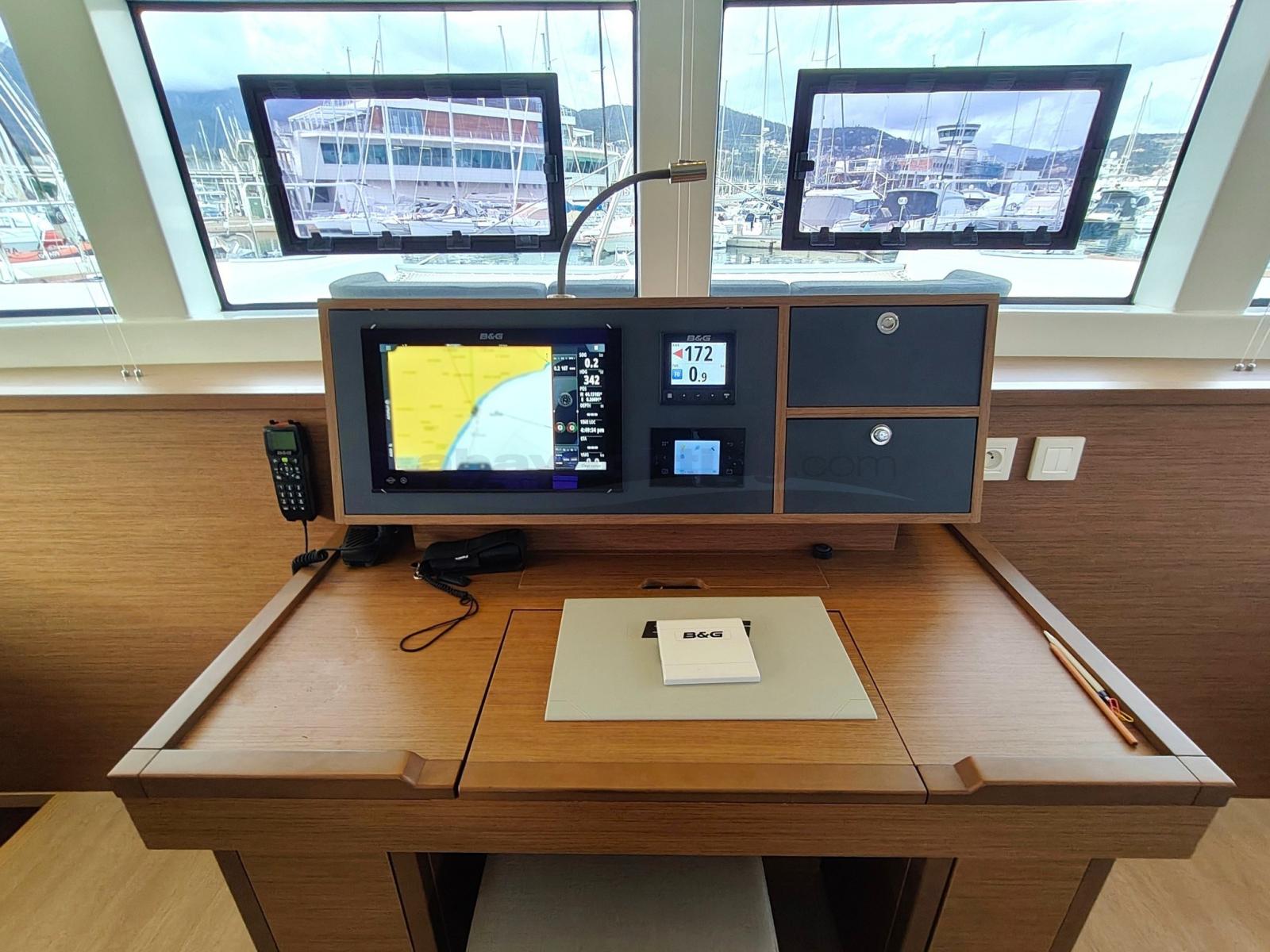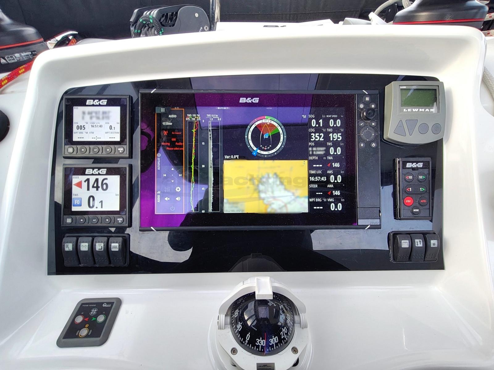 AIS (B&G), Angolo barra, Antenna radar, Bussola (Plastimo), Computer di bordo, Contametri catena, Contamiglia (B&G), 3 Display (Triton B&G), Ecoscandaglio (B&G), Log (B&G), Pilota automatico (B&G), Plotter con antenna GPS (B&G Zeus), Radar (B&G Zeus), Radio VHF (B&G), Stazione vento (B&G).